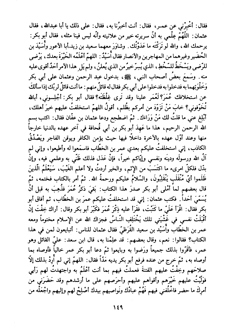 أَبْلِغْ عَنِّي مَا قُلْتُ لَكَ مَنْ وَرَاءَكَ. ثُمَّ اضْطَجَعَ وَدَعَا عُثْمَانَ بْنَ عَفَّانَ فَقَالَ: اكْتُبْ بِسْمِ اللَّهِ الرَّحْمَنِ الرَّحِيمِ. هَذَا مَا عَهِدَ أَبُو بَكْرِ بْنُ أَبِي قُحَافَةَ فِي آخِرِ عَهْدِهِ بِالدُّنْيَا خَارِجًا مِنْهَا وَعِنْدَ أَوَّلِ عَهْدِهِ بِالآخِرَةِ دَاخِلا فِيهَا حَيْثُ يُؤْمِنُ الْكَافِرُ وَيُوقِنُ الْفَاجِرُ وَيُصَدِّقُ الْكَاذِبَ. إِنِّي اسْتَخْلَفْتُ عَلَيْكُمْ بَعْدِي عُمَرَ بْنَ الْخَطَّابِ فَاسْمَعُوا لَهُ وَأَطِيعُوا. وَإِنِّي لَمْ آلُ اللَّهَ وَرَسُولَهُ وَدِينَهُ وَنَفْسِي وَإِيَّاكُمْ خَيْرًا. فَإِنْ عَدَلَ فَذَلِكَ ظَنِّي بِهِ وَعِلْمِي فِيهِ. وَإِنْ بَدَّلَ فَلِكُلِّ امْرِئٍ مَا اكْتَسَبَ مِنَ الإِثْمِ. وَالْخَيْرُ أَرَدْتُ وَلا أَعْلَمُ الْغَيْبَ. سَيَعْلَمُ الَّذِينَ ظَلَمُوا أَيَّ مُنْقَلَبٍ يَنْقَلِبُونَ. وَالسَّلامُ عَلَيْكُمْ وَرَحْمَةُ اللَّهِ. ثُمَّ أَمَرَ بِالْكِتَابِ فَخَتَمَهُ. ثُمَّ قَالَ بَعْضُهُمْ لَمَّا أَمْلَى أَبُو بَكْرٍ صَدْرَ هَذَا الْكِتَابِ: بَقِيَ ذِكْرُ عُمَرَ فَذَهَبَ بِهِ قَبْلَ أَنْ يُسَمِّيَ أَحَدًا. فَكَتَبَ عُثْمَانُ: إِنِّي قَدِ اسْتَخْلَفْتُ عَلَيْكُمْ عُمَرَ بْنَ الْخَطَّابِ. ثُمَّ أَفَاقَ أَبُو بَكْرٍ فَقَالَ: اقْرَأْ عَلَيَّ مَا كَتَبْتَ. فَقَرَأَ عَلَيْهِ ذِكْرَ عُمَرَ فَكَبَّرَ أَبُو بَكْرٍ وَقَالَ: أَرَاكَ خِفْتَ إِنْ أَقْبَلَتْ نَفْسِي فِي غَشْيَتِي تِلْكَ يَخْتَلِفُ النَّاسُ فجزاك الله عن الإسلام مَخْتُومًا وَمَعَهُ عُمَرُ بْنُ الْخَطَّابِ وَأُسَيْدُ بْنُ سَعِيدٍ الْقُرَظِيُّ فَقَالَ عُثْمَانُ لِلنَّاسِ: أَتُبَايِعُونَ لِمَنْ فِي هَذَا الْكِتَابِ؟ فَقَالُوا: نَعَمْ. وَقَالَ بَعْضُهُمْ: قَدْ عَلِمْنَا بِهِ. قَالَ ابْنُ سَعْدٍ: عَلِيٌّ الْقَائِلُ وَهُوَ عُمَرُ. فَأَقَرُّوا بِذَلِكَ جَمِيعًا وَرَضُوا بِهِ وَبَايَعُوا ثُمَّ دَعَا أَبُو بَكْرٍ عُمَرَ خَالِيًا فَأَوْصَاهُ بِمَا أَوْصَاهُ بِهِ. ثُمَّ خَرَجَ مِنْ عِنْدَهُ فَرَفَعَ أَبُو بَكْرٍ يَدَيْهِ مَدًّا فَقَالَ: اللَّهُمَّ إِنِّي لَمْ أُرِدْ بِذَلِكَ إِلا صَلاحَهُمْ وَخِفْتُ عَلَيْهِمُ الْفِتْنَةَ فَعَمِلْتُ فِيهِمْ بِمَا أَنْتَ أَعْلَمُ بِهِ وَاجْتَهَدْتُ لَهُمْ رَأْيِي فَوَلَّيْتُ عَلَيْهِمْ خَيْرَهُمْ وَأَقْوَاهُمْ عَلَيْهِمْ وَأَحْرَصَهُمْ عَلَى مَا أَرْشَدَهُمْ وَقَدْ حَضَرَنِي مِنْ أَمْرِكَ مَا حَضَرَ فَاخْلُفْنِي فِيهِمْ فَهُمْ عِبَادُكَ وَنَوَاصِيهِمْ بِيَدِكَ أَصْلِحْ لَهُمْ وَإِلَيْهِمْ وَاجْعَلْهُ مِنْ