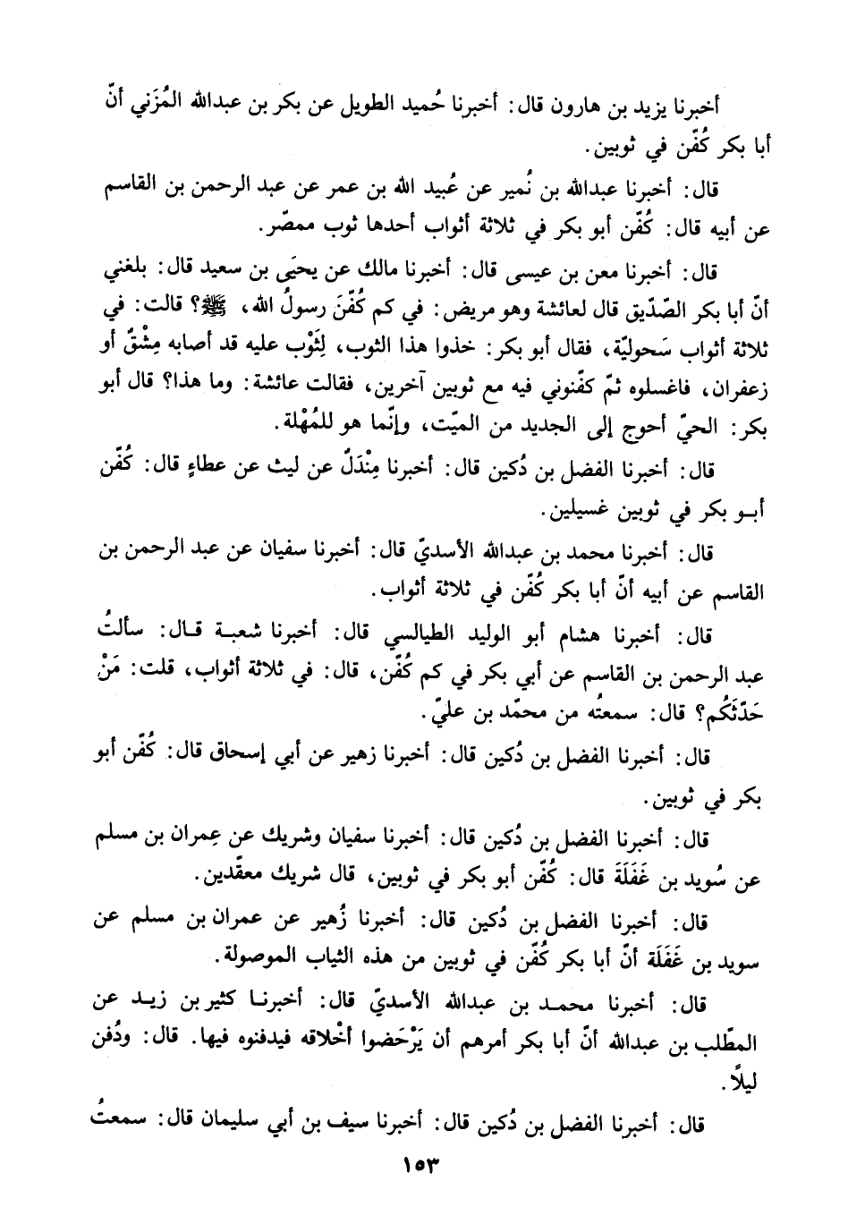 قَالَ: أَخْبَرَنَا الْفَضْلُ بْنُ دُكَيْنٍ قَالَ: أَخْبَرَنَا سُفْيَانُ وَشَرِيكٌ عَنْ عِمْرَانَ بْنِ مُسْلِمٍ عَنْ سُوَيْدِ بْنِ غَفَلَةَ قَالَ: كُفِّنَ أَبُو بَكْرٍ فِي ثَوْبَيْنِ. قَالَ شَرِيكٌ مُعَقَّدَيْنِ.