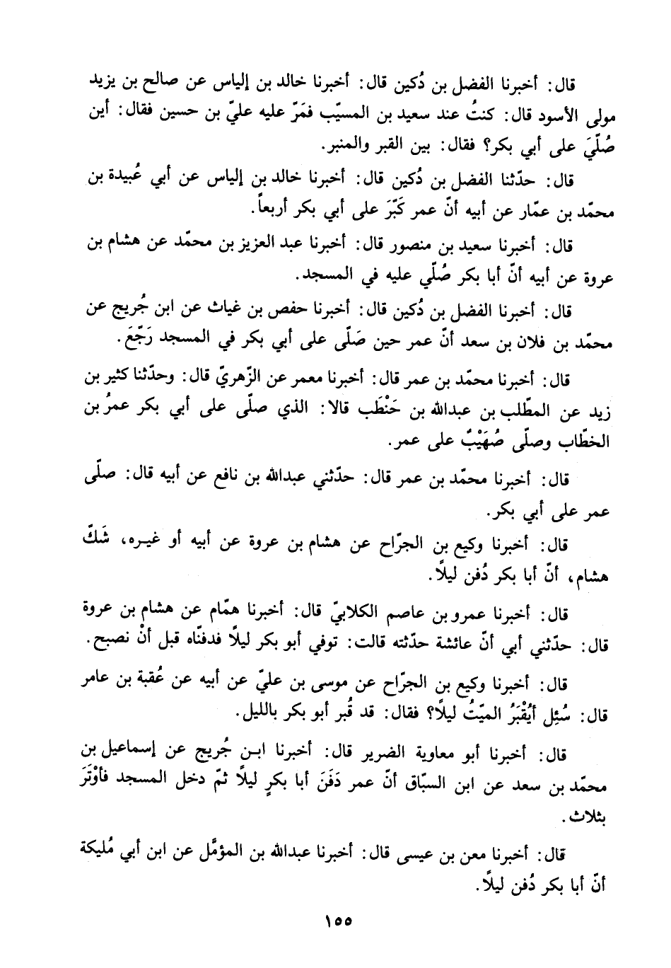 قَالَ: أَخْبَرَنَا عَمْرُو بْنُ عَاصِمٍ الْكِلابِيُّ قَالَ: أَخْبَرَنَا هَمَّامٌ عَنْ هِشَامِ بْنِ عُرْوَةَ قَالَ: حَدَّثَنِي أَبِي أَنَّ عَائِشَةَ حَدَّثَتْهُ قَالَتْ: تُوُفِّيَ أَبُو بَكْرٍ لَيْلا فَدَفَنَّاهُ قَبْلَ أَنْ نُصْبِحَ.