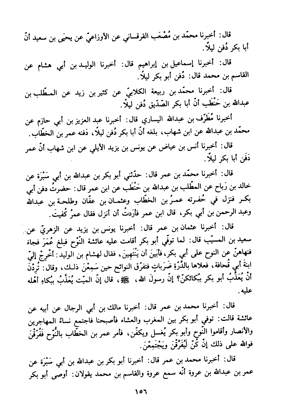 أَخْبَرَنَا مُطَرِّفُ بْنُ عَبْدِ اللَّهِ الْيَسَارِيِّ قَالَ: أَخْبَرَنَا عَبْدُ الْعَزِيزِ بْنُ أَبِي حَازِمٍ عَنْ مُحَمَّدِ بْنِ عَبْدِ اللَّهِ عَنِ ابْنِ شِهَابٍ. بَلَغَهُ أَنَّ أَبَا بَكْرٍ دُفِنَ لَيْلا. دَفَنَهُ عُمَرُ بْنُ الْخَطَّابِ.