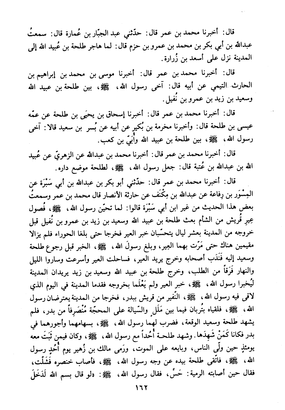 قَالَ: أَخْبَرَنَا مُحَمَّدُ بْنُ عُمَرَ قَالَ: حَدَّثَنِي أَبُو بَكْرِ بْنُ عَبْدِ اللَّهِ بْنِ أَبِي سبرة عَنِ الْمِسْوَرِ بْنِ رِفَاعَةَ عَنْ عَبْدِ اللَّهِ بن مكنف عن حَارِثَةَ الأَنْصَارِ قَالَ مُحَمَّدُ بْنُ عُمَرَ وَسَمِعْتُ بَعْضَ هَذَا الْحَدِيثِ مِنْ غَيْرِ ابْنِ أَبِي سَبْرَةَ قَالُوا: لَمَّا تَحَيَّنَ رَسُول اللَّهِ - صَلَّى اللَّهُ عَلَيْهِ وَسَلَّمَ - فُصُولَ عِيرِ قُرَيْشٍ مِنَ الشَّامِ بَعَثَ طَلْحَةَ بْن عُبَيْد اللَّه وَسَعِيدَ بْن زيد بن عمرو بن نفيل قبل خُرُوجِهِ مِنَ الْمَدِينَةِ بِعَشْرِ لَيَالٍ يَتَحَسَّبَانِ خَبَرَ الْعِيرِ فَخَرَجَا حَتَّى بَلَغَا الْحَوْرَاءَ فَلَمْ يَزَالا مُقِيمَيْنِ هُنَاكَ حَتَّى مَرَّتْ بِهِمَا الْعِيرُ. وَبَلَغَ رَسُولَ اللَّهِ - صَلَّى اللَّهُ عَلَيْهِ وَسَلَّمَ - الخبر قَبْلَ رُجُوعِ طَلْحَةَ وَسَعِيدٍ إِلَيْهِ فَنَدَبَ أَصْحَابَهُ وَخَرَجَ يُرِيدُ الْعِيرَ. فَسَاحَلَتِ الْعِيرُ وَأَسْرَعَتْ وَسَارُوا اللَّيْلَ وَالنَّهَارَ فَرَقًا مِنَ الطَّلَبِ. وَخَرَجَ طَلْحَةُ بْن عُبَيْد اللَّه وَسَعِيدُ بْن زَيْدٍ يُرِيدَانِ الْمَدِينَةَ لِيُخْبِرَا رَسُول اللَّهِ - صَلَّى اللَّهُ عَلَيْهِ وَسَلَّمَ - خَبَرَ الْعِيرِ وَلَمْ يَعْلَمَا بِخُرُوجِهِ فَقَدِمَا الْمَدِينَةَ فِي الْيَوْمِ الَّذِي لاقَى فِيهِ رَسُولُ اللَّهِ - صَلَّى اللَّهُ عَلَيْهِ وَسَلَّمَ - النَّفِيرَ مِنْ قُرَيْشٍ بِبَدْرٍ. فَخَرَجَا مِنَ الْمَدِينَةِ يَعْتَرِضَانِ رَسُولَ اللَّهِ - صَلَّى اللَّهُ عَلَيْهِ وَسَلَّمَ - فَلَقِيَاهُ بِتُرْبَانَ فِيمَا بَيْنَ مَلَلٍ وَالسَّيَالَةِ عَلَى الْمَحَجَّةِ مُنْصَرِفًا مِنْ بَدْرٍ. فَلَمْ يَشْهَدْ طَلْحَةُ وَسَعِيدٌ الْوَقْعَةَ. فَضَرَبَ لَهُمَا رَسُولُ اللَّهِ - صَلَّى اللَّهُ عَلَيْهِ وَسَلَّمَ - بِسِهَامِهِمَا وَأُجُورِهِمَا فِي بَدْرٍ فَكَانَا كَمَنْ شَهِدَهَا. وَشَهِدَ طَلْحَةُ أُحُدًا مَعَ رَسُولِ اللَّهِ - صَلَّى اللَّهُ عَلَيْهِ وَسَلَّمَ - وَكَانَ فِيمَنْ ثَبَتَ مَعَهُ يَوْمَئِذٍ حِينَ وَلَّى النَّاسُ. وَبَايَعَهُ عَلَى الْمَوْتِ. وَرَمَى مَالِكُ بْنُ زُهَيْرٍ يَوْمَ أُحُدٍ رَسُولَ اللَّهِ - صَلَّى اللَّهُ عَلَيْهِ وَسَلَّمَ - فَاتَّقَى طَلْحَةُ بِيَدِهِ عَنْ وَجْهِ رَسُولِ اللَّهِ - صَلَّى اللَّهُ عَلَيْهِ وَسَلَّمَ - فَأَصَابَ خِنْصَرَهُ فَشَلَّتْ.