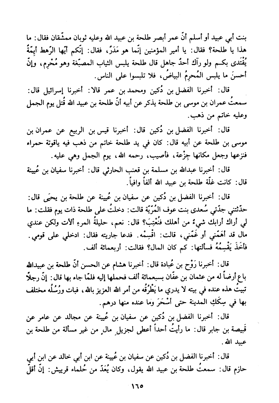 قَالَ: أَخْبَرَنَا الْفَضْلُ بْنُ دُكَيْنٍ عَنْ سُفْيَانَ بْنِ عُيَيْنَةَ عَنْ مُجَالِدٍ عَنْ عَامِرٍ عَنْ قَبِيصَةَ بْنِ جَابِرٍ قَالَ: مَا رَأَيْتُ أَحَدًا أَعْطَى لِجَزِيلِ مَالٍ مِنْ غَيْرِ مَسْأَلَةٍ مِنْ طَلْحَةَ بْنِ عُبَيْدِ اللَّهِ.