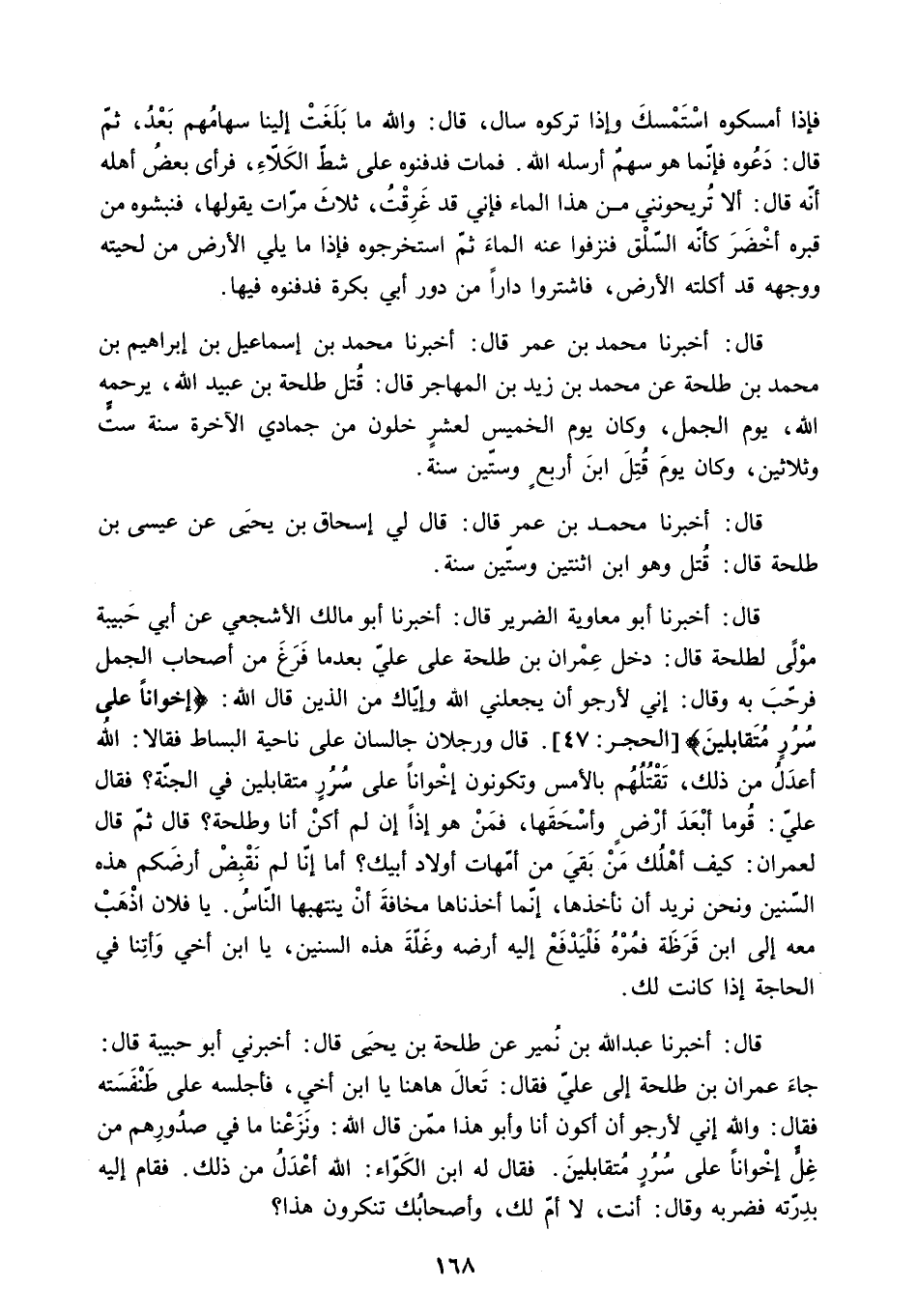[قَالَ: أَخْبَرَنَا أَبُو مُعَاوِيَةَ الضَّرِيرُ قَالَ: أَخْبَرَنَا أَبُو مَالِكٍ الأَشْجَعِيُّ عَنْ أَبِي حَبِيبَةَ مَوْلَى لِطَلْحَةَ قَالَ: دَخَلَ عِمْرَانُ بْنُ طلحة على علي بعد ما فَرَغَ مِنْ أَصْحَابِ الْجَمَلِ فَرَحَّبَ بِهِ وَقَالَ: إِنِّي لأَرْجُو أَنْ يَجْعَلَنِي اللَّهُ وَإِيَّاكَ مِنَ الَّذِينَ قَالَ اللَّهُ: «إِخْواناً عَلى سُرُرٍ مُتَقابِلِينَ» الحجر: 47. قَالَ وَرَجُلانِ جَالِسَانِ عَلَى نَاحِيَةِ الْبِسَاطِ فَقَالا: اللَّهُ أَعْدَلُ مِنْ ذَلِكَ. تَقْتُلُهُمْ بِالأَمْسِ وَتَكُونُونَ إِخْواناً عَلى سُرُرٍ مُتَقابِلِينَ فِي الْجَنَّةِ؟ فَقَالَ عَلِيٌّ: قُومَا أَبْعَدَ أَرْضٍ وَأَسْحَقَهَا. فَمَنْ هُوَ إِذًا إِنْ لَمْ أَكُنْ أَنَا وَطَلْحَةُ؟ قَالَ ثُمَّ قَالَ لِعِمْرَانَ: كَيْفَ أَهْلُكَ مَنْ بَقِيَ مِنْ أُمَّهَاتِ أَوْلادِ أَبِيكَ؟ أَمَا إِنَّا لَمْ نَقْبِضْ أَرْضَكُمْ هَذِهِ السِّنِينَ وَنَحْنُ نُرِيدُ أَنْ نَأْخُذَهَا. إِنَّمَا أَخَذْنَاهَا مَخَافَةَ أَنْ يَنْتَهِبَهَا النَّاسُ. يَا فُلانُ اذْهَبْ مَعَهُ إِلَى ابْنِ قَرَظَةَ فَمُرْهُ فَلْيَدْفَعْ إِلَيْهِ أَرْضَهُ وَغَلَّةَ هَذِهِ السِّنِينَ. يَا ابْنَ أَخِي وَأَتِنَا فِي الْحَاجَةِ إِذَا كَانَتْ لَكَ] .
