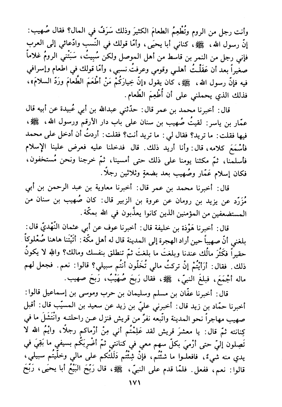بَلَغَنِي أَنَّ صُهَيْبًا حِينَ أَرَادَ الْهِجْرَةَ إِلَى الْمَدِينَةِ قَالَ لَهُ أَهْلُ مَكَّةَ: أَتَيْتَنَا هَاهُنَا صُعْلُوكًا حَقِيرًا فَكَثُرَ مَالُكَ عِنْدَنَا وَبَلَغْتَ مَا بَلَغْتَ ثُمَّ تَنْطَلِقُ بِنَفْسِكَ وَمَالِكَ؟ وَاللَّهِ لا يَكُونُ ذَلِكَ. فَقَالَ: أَرَأَيْتُمْ إِنْ تَرَكْتُ مَالِي تُخَلُّونَ أَنْتُمْ سَبِيلِي؟ قَالُوا: نَعَمْ. فَجَعَلَ لَهُمْ مَالَهُ أَجْمَعَ. [فَبَلَغَ النَّبِيَّ - صَلَّى اللَّهُ عَلَيْهِ وَسَلَّمَ - فَقَالَ رَبِحَ صُهَيْبٌ. رَبِحَ صُهَيْبٌ] .