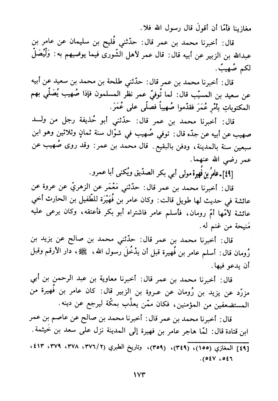قَالَ: أَخْبَرَنَا مُحَمَّدُ بْنُ عُمَرَ قَالَ: حَدَّثَنِي محمد بن صالح عن يزيد بن رومان قال: أسلم عامر بْنُ فُهَيْرَةَ قَبْلَ أَنْ يَدْخُلْ رَسُولُ اللَّهِ - صَلَّى اللَّهُ عَلَيْهِ وَسَلَّمَ - دَارَ الأَرْقَمِ وَقَبْلَ أَنْ يَدْعُوَ فِيهَا.