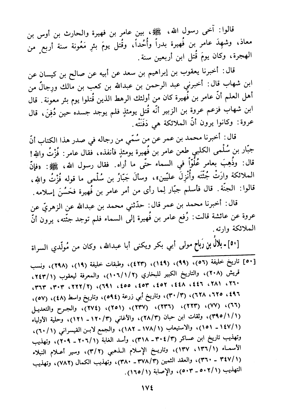 قَالَ: أَخْبَرَنَا يَعْقُوبُ بْنُ إِبْرَاهِيمَ بْنِ سَعْدٍ عَنْ أَبِيهِ عَنْ صَالِحِ بْنِ كَيْسَانَ عَنِ ابْنِ شِهَابٍ قَالَ: أَخْبَرَنِي عَبْدُ الرَّحْمَنِ بْنُ عَبْدِ اللَّهِ بْنِ كَعْبِ بْنِ مَالِكٍ وَرِجَالٌ مِنْ أَهْلِ الْعِلْمِ أَنَّ عَامِرَ بْنَ فُهَيْرَةَ كَانَ مِنْ أُولَئِكِ الرَّهْطِ الَّذِينَ قُتِلُوا يَوْمَ بِئْرِ مَعُونَةَ. قَالَ ابْنُ شِهَابٍ فَزَعَمَ عُرْوَةُ بْنُ الزُّبَيْرِ أَنَّهُ قُتِلَ يَوْمَئِذٍ فَلَمْ يُوجَدْ جَسَدُهُ حِينَ دُفِنَ. قَالَ عُرْوَةُ: وكانوا يرون أن الملائكة هي دفنته.