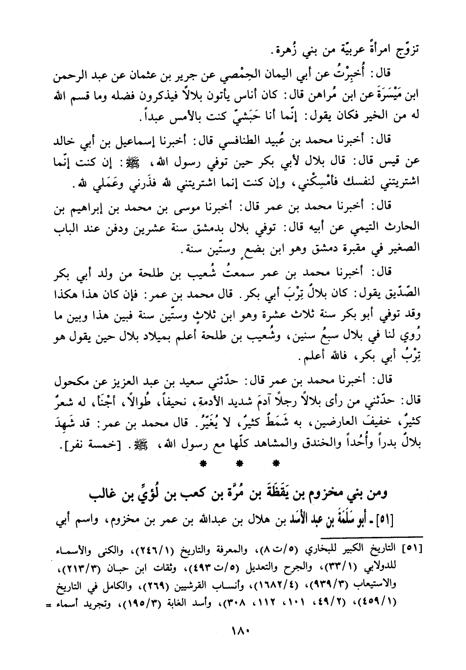 51 التاريخ الكبير للبخاري (5/ ت 8) ، والمعرفة والتاريخ (1/ 246) ، والكنى والأسماء للدولابي (1/ 33) ، والجرح والتعديل (5/ ت 493) ، وثقات ابن حبان (3/ 213) ، والاستيعاب (3/ 939) ، (4/ 1682) ، وأنساب القرشيين (269) ، والكامل في التاريخ (1/ 459) ، (2/ 49، 101، 112، 308) ، وأسد الغابة (3/ 195) ، وتجريد أسماء الصحابة (1/ ت 3381) ، وتهذيب الكمال (3369) ، وتهذيب التهذيب (5/ 278، 288) ، والإصابة (2/ ت 4783) ، وتقريب التهذيب (1/ 427) ، وخلاصة الخزرجي (2/ ت 3603) ، وحذف من نسب قريش (73) ، (74) .