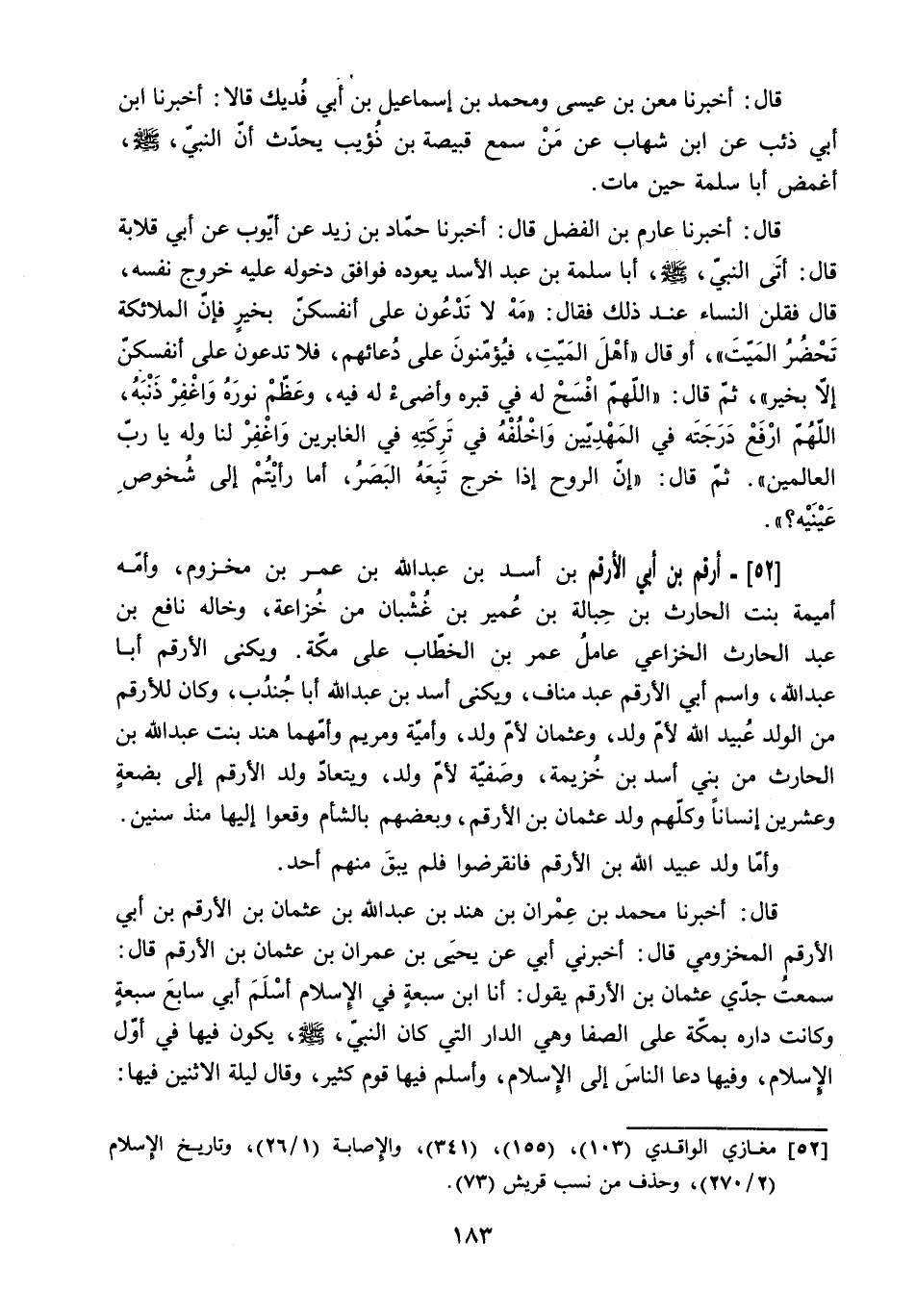 52 مغازي الواقدي (103) ، (155) ، (341) ، والإصابة (1/ 26) ، وتاريخ الإسلام (2/ 270) ، وحذف من نسب قريش (73) .