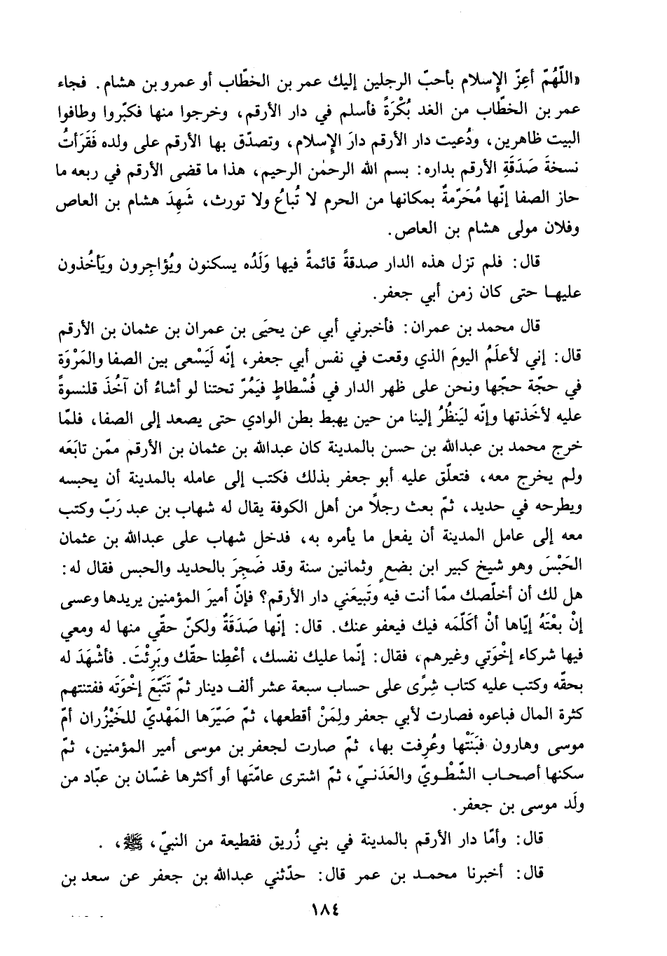 اللَّهُمَّ أَعِزَّ الإِسْلامَ بِأَحَبِّ الرَّجُلَيْنِ إِلَيْكَ عُمَرَ بْنِ الْخَطَّابِ أَوْ عَمْرِو بْنِ هِشَامٍ. فَجَاءَ عُمَرُ بْنُ الْخَطَّابِ مِنَ الْغَدِ بُكْرَةً فَأَسْلَمَ فِي دَارِ الأَرْقَمِ. وَخَرَجُوا مِنْهَا فَكَبِّرُوا وَطَافُوا الْبَيْتَ ظَاهِرِينَ. وَدُعِيَتْ دَارُ الأَرْقَمِ دَارُ الإِسْلامِ. وَتَصَدَّقَ بِهَا الأَرْقَمُ عَلَى وَلَدِهِ فَقَرَأْتُ نُسْخَةَ صَدَقَةِ الأَرْقَمِ بِدَارِهِ: بِسْمِ اللَّهِ الرَّحْمَنِ الرَّحِيمِ. هَذَا مَا قَضَى الأَرْقَمُ فِي رُبُعِهِ مَا حَازَ الصَّفَا إِنَّهَا مُحَرَّمَةٌ بِمَكَانِهَا مِنَ الْحَرَمِ لا تُبَاعُ وَلا تُوَرَّثُ. شَهِدَ هِشَامُ بْنُ الْعَاصِ وَفُلانٌ مَوْلَى هِشَامِ بْنِ الْعَاصِ.