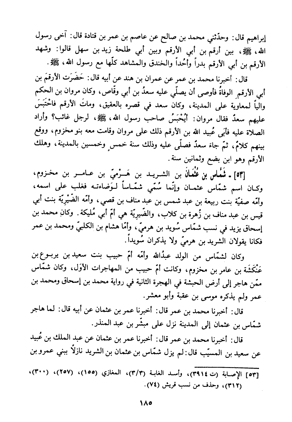 إِبْرَاهِيمَ قَالَ: وَحَدَّثَنِي مُحَمَّدُ بْنُ صَالِحٍ عَنْ عَاصِمِ بْنِ عُمَرَ بْنِ قَتَادَةَ قَالَ: آخَى رَسُولُ اللَّهِ - صَلَّى اللَّهُ عَلَيْهِ وَسَلَّمَ - بَيْنَ أَرْقَمَ بْنِ أَبِي الأَرْقَمِ وَبَيْنَ أَبِي طَلْحَةَ زَيْدِ بْنِ سَهْلٍ قَالُوا: وَشَهِدَ الأَرْقَمُ بْنُ أَبِي الأَرْقَمِ بَدْرًا وَأُحُدًا وَالْخَنْدَقَ وَالْمَشَاهِدَ كُلَّهَا مَعَ رَسُولِ اللَّهِ - صَلَّى اللَّهُ عَلَيْهِ وَسَلَّمَ -
