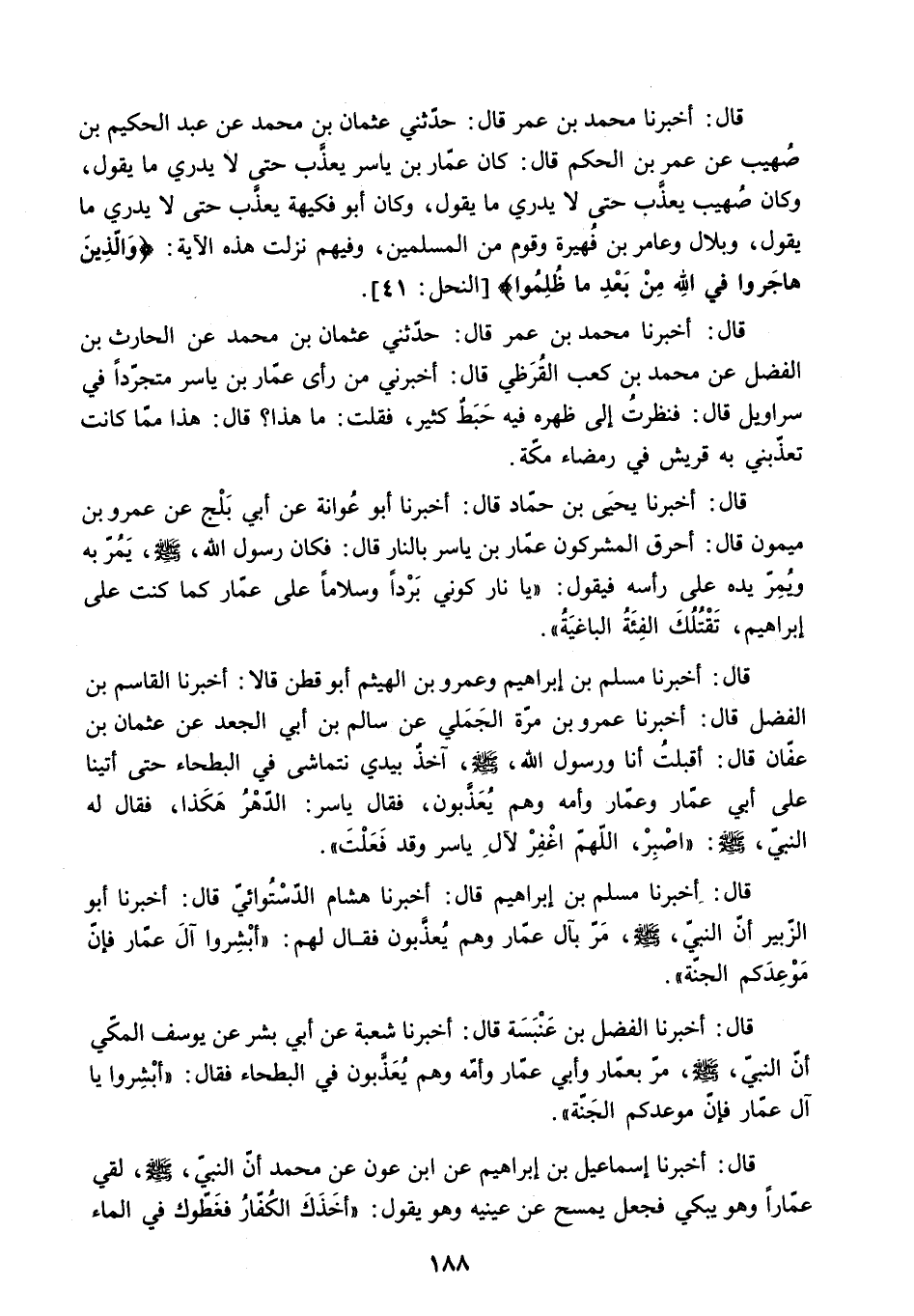 [قَالَ: أَخْبَرَنَا الْفَضْلُ بْنُ عَنْبَسَةَ قَالَ: أَخْبَرَنَا شُعْبَةُ عَنْ أَبِي بِشْرٍ عَنْ يُوسُفَ الْمَكِّيِّ أَنَّ النَّبِيَّ - صَلَّى اللَّهُ عَلَيْهِ وَسَلَّمَ - مَرَّ بِعَمَّارٍ وَأَبِي عَمَّارٍ وَأُمِّهِ وَهُمْ يُعَذَّبُونَ فِي الْبَطْحَاءِ فَقَالَ: أَبْشِرُوا يَا آلَ عَمَّارٍ فَإِنَّ مَوْعِدَكُمُ الْجَنَّةُ] .