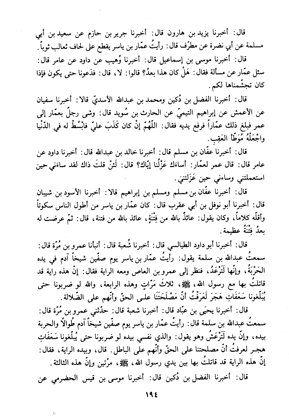 قَالَ: أَخْبَرَنَا عَفَّانُ بْنُ مُسْلِمٍ وَمُسْلِمُ بْنُ إِبْرَاهِيمَ قَالا: أَخْبَرَنَا الأَسْوَدُ بْنُ شَيْبَانَ قَالَ: أَخْبَرَنَا أَبُو نَوْفَلِ بْنُ أَبِي عَقْرَبٍ قَالَ: كَانَ عَمَّارُ بْنُ يَاسِرٍ مِنْ أَطْوَلِ النَّاسِ سُكُوتًا وَأَقَلِّهِ كَلامًا. وَكَانَ يَقُولُ: عَائِذٌ بِاللَّهِ مِنْ فِتْنَةٍ. عَائِذٌ بِاللَّهِ مِنْ فِتْنَةٍ. قَالَ: ثُمَّ عُرِضَتْ لَهُ بَعْدُ فِتْنَةٌ عَظِيمَةٌ.