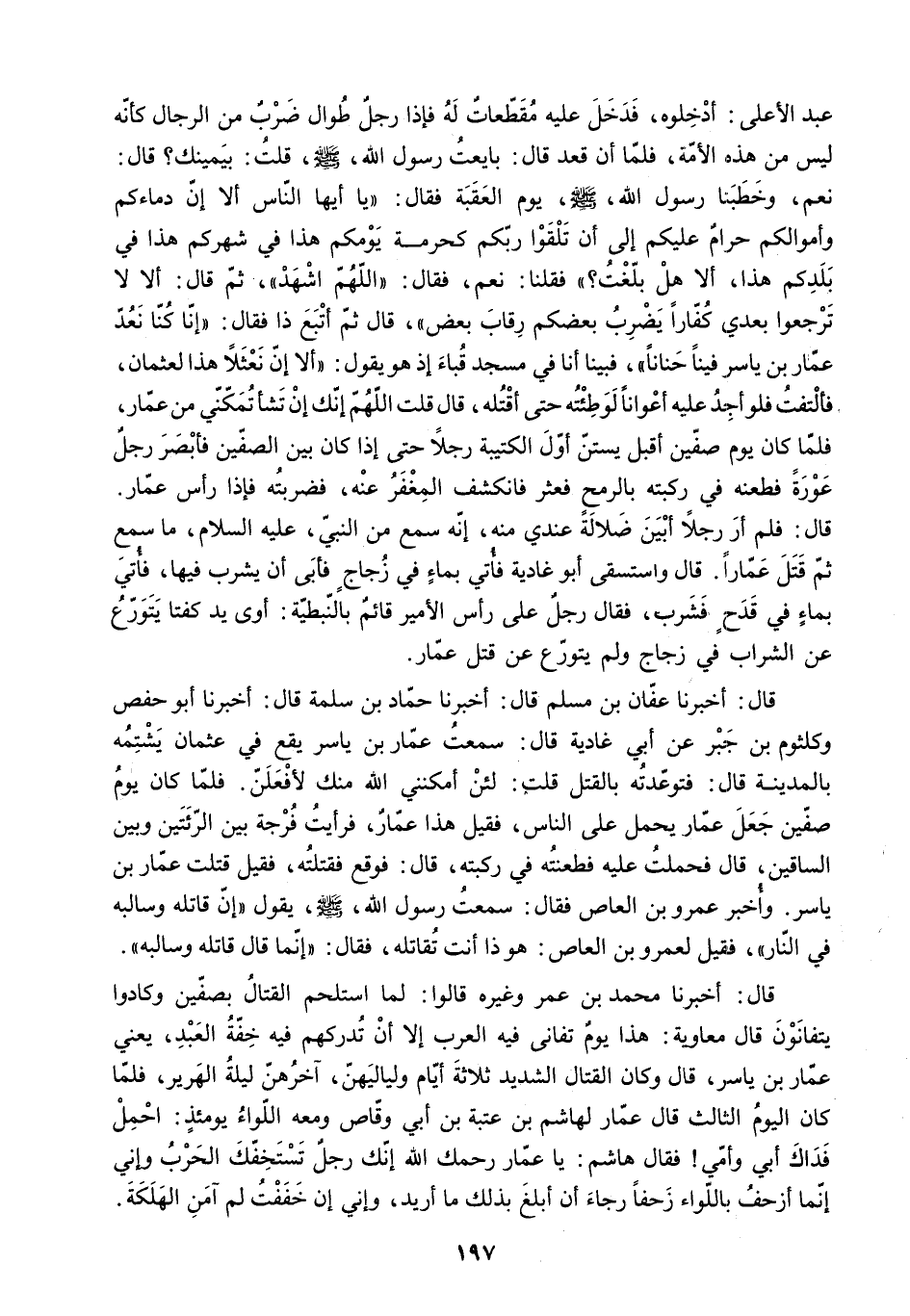 قَالَ: أَخْبَرَنَا عَفَّانُ بْنُ مُسْلِمٍ قَالَ: أَخْبَرَنَا حَمَّادُ بْنُ سَلَمَةَ قَالَ: أَخْبَرَنَا أَبُو حَفْصٍ وَكُلْثُومُ بْنُ جَبْرٍ عَنْ أَبِي غَادِيَةَ قَالَ: سَمِعْتُ عَمَّارَ بْنَ يَاسِرٍ يَقَعُ فِي عُثْمَانَ يَشْتِمُهُ بِالْمَدِينَةِ قَالَ: فَتَوَعَّدْتُهُ بِالْقَتْلِ قُلْتُ: لَئِنْ أَمْكَنَنِي اللَّهُ مِنْكَ لأَفْعَلَنَّ. فَلَمَّا كَانَ يَوْمُ صِفِّينَ جَعَلَ عَمَّارٌ يَحْمِلُ عَلَى النَّاسِ. فَقِيلَ هَذَا عَمَّارٌ. فَرَأَيْتُ فُرْجَةً بَيْنَ الرِّئَتَيْنِ وَبَيْنَ السَّاقَيْنِ. قَالَ فَحَمَلْتُ عَلَيْهِ فَطَعَنْتُهُ فِي رُكْبَتِهِ. قَالَ: فَوَقَعَ فَقَتَلْتُهُ. فَقِيلَ قَتَلْتَ عَمَّارَ بْنَ يَاسِرٍ. وَأُخْبِرَ عَمْرُو بْنُ الْعَاصِ فَقَالَ: [سَمِعْتُ رَسُولَ اللَّهِ - صَلَّى اللَّهُ عَلَيْهِ وسلم - يقول إِنَّ قَاتِلَهُ وَسَالِبَهُ فِي النَّارِ] . فَقِيلَ لِعَمْرِو بْنِ الْعَاصِ: هُوَ ذَا أَنْتَ تُقَاتِلُهُ. فَقَالَ: إِنَّمَا قَالَ قَاتِلَهُ وَسَالِبَهُ.