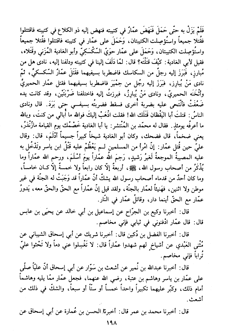 وَمَا كَانَ أَحَدٌ مِنْ قُدَمَاءِ أَصْحَابِ رَسُولِ اللَّهِ يَشُكُّ أَنَّ عَمَّارًا قَدْ وَجَبَتْ لَهُ الْجَنَّةُ فِي غَيْرِ مَوْطِنٍ وَلا اثْنَيْنِ. فَهَنِيئًا لِعَمَّارٍ بِالْجَنَّةَ. وَلَقَدْ قِيلَ إِنَّ عَمَّارًا مَعَ الْحَقَّ وَالْحَقُّ مَعَهُ. يَدُورُ عَمَّارٌ مَعَ الْحَقِّ أَيْنَمَا دَارَ. وَقَاتِلُ عَمَّارٍ فِي النَّارِ] .