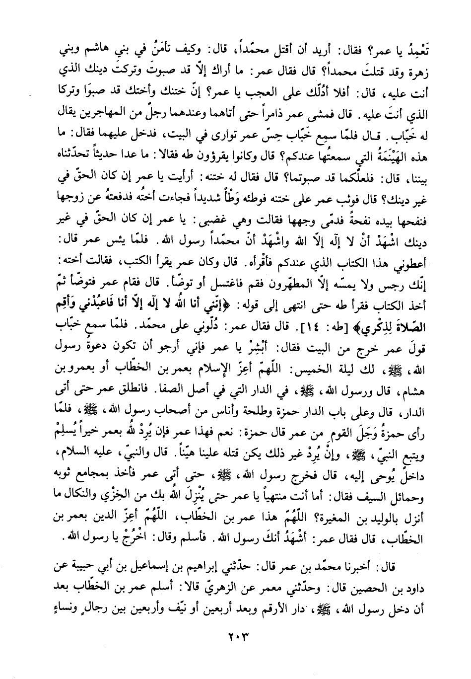 إِنَّكَ رِجْسٌ وَلا يَمَسُّهُ إِلَّا الْمُطَهَّرُونَ فَقُمْ فَاغْتَسِلْ أَوْ تَوَضَّأْ. قَالَ فَقَامَ عُمَرُ فَتَوَضَّأَ ثُمَّ أَخَذَ الْكِتَابَ فَقَرَأَ طه حَتَّى انْتَهَى إِلَى قَوْلِهِ: «إِنَّنِي أَنَا اللَّهُ لا إِلهَ إِلَّا أَنَا فَاعْبُدْنِي وَأَقِمِ الصَّلاةَ لِذِكْرِي» طه: 14. قَالَ فَقَالَ عُمَرُ: دُلُّونِي عَلَى مُحَمَّدٍ. فَلَمَّا سَمِعَ خَبَّابٌ قَوْلَ عُمَرَ خَرَجَ مِنَ الْبَيْتِ فَقَالَ: أَبْشِرْ يَا عُمَرُ [فَإِنِّي أَرْجُو أَنْ تَكُونَ دَعْوَةَ رَسُولِ اللَّهِ - صَلَّى اللَّهُ عَلَيْهِ وَسَلَّمَ - لَكَ لَيْلَةَ الْخَمِيسِ: اللَّهُمَّ أَعِزَّ الإِسْلامَ بِعُمَرَ بْنِ الْخَطَّابِ أَوْ بِعَمْرِو بْنِ هِشَامٍ.] قَالَ وَرَسُولُ اللَّهِ - صَلَّى اللَّهُ عَلَيْهِ وَسَلَّمَ - فِي الدَّارِ الَّتِي فِي أَصْلِ الصَّفَا. فَانْطَلَقَ عُمَرُ حَتَّى أَتَى الدَّارَ. قَالَ وَعَلَى بَابِ الدَّارِ حَمْزَةُ وَطَلْحَةُ وَأُنَاسٌ مِنْ أَصْحَابِ رَسُولِ اللَّهِ - صَلَّى اللَّهُ عَلَيْهِ وَسَلَّمَ - فَلَمَّا رَأَى حَمْزَةُ وَجَلَ الْقَوْمِ مِنْ عُمَرَ قَالَ حَمْزَةُ: نعم فهذا عمر فإن يرد لله بِعُمَرَ خَيْرًا يُسْلِمْ وَيَتْبَعِ النَّبِيَّ - صَلَّى اللَّهُ عَلَيْهِ وَسَلَّمَ - وَإِنْ يُرِدْ غَيْرَ ذَلِكَ يَكُنْ قتله علينا هينا. قال والنبي. ع.