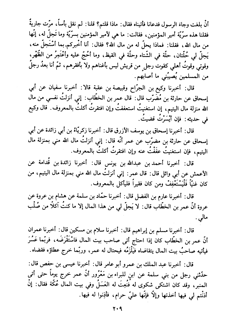 قَالَ: أَخْبَرَنَا إِسْحَاقُ بْنُ يُوسُفَ الأَزْرَقُ قَالَ: أخبرنا زكرياء بْنُ أَبِي زَائِدَةَ عَنْ أَبِي إِسْحَاقَ عَنْ حَارِثَةَ بْنِ مُضَرِّبٍ عَنْ عُمَرَ أَنَّهُ قَالَ: إِنِّي أَنْزَلْتُ مَالَ اللَّهِ مِنِّي بِمَنْزِلَةِ مَالِ الْيَتِيمِ. فَإِنِ اسْتَغْنَيْتُ عَفَفْتُ عَنْهُ وَإِنِ افْتَقَرْتُ أَكَلْتُ بِالْمَعْرُوفِ.
