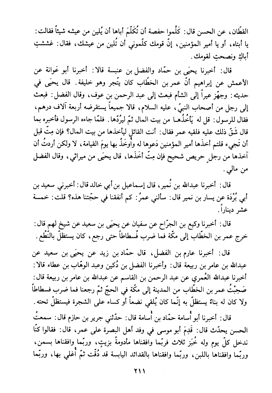 الْقَطَّانَ. عَنِ الْحَسَنِ قَالَ: كَلَّمُوا حَفْصَةَ أَنْ تَكَلَّمَ أَبَاهَا أَنْ يُلِينَ مِنْ عَيْشِهِ شَيْئًا فَقَالَتْ: