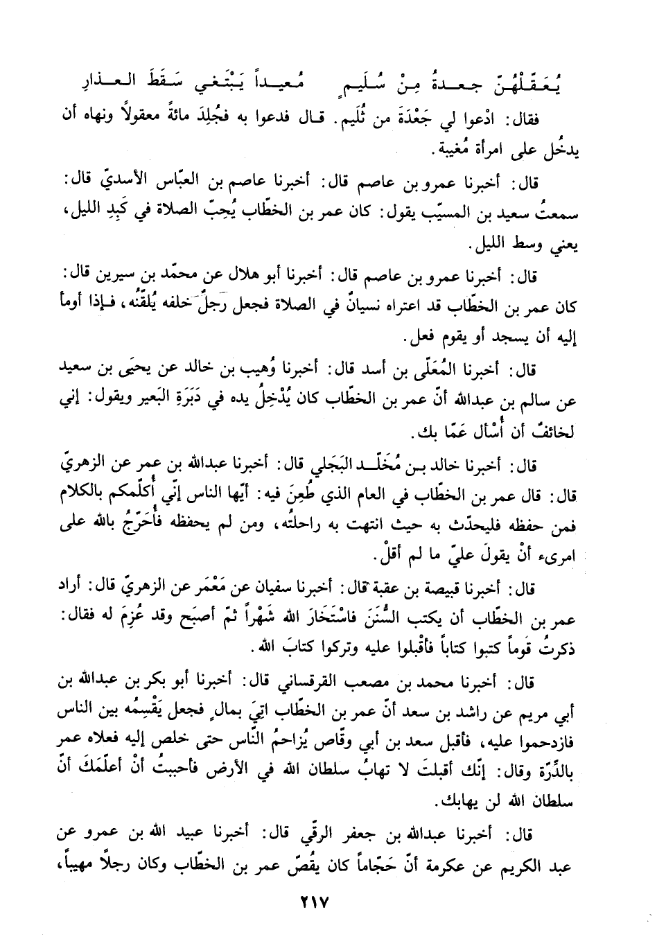 قَالَ: أَخْبَرَنَا الْمُعَلَّى بْنُ أَسَدٍ قَالَ: أَخْبَرَنَا وُهَيْبُ بْنُ خَالِدٍ عَنْ يَحْيَى بْنِ سَعِيدٍ عَنْ سَالِمِ بْنِ عَبْدِ اللَّهِ أَنَّ عُمَرَ بْنَ الْخَطَّابِ كَانَ يُدْخِلُ يَدَهُ فِي دَبَرَةِ الْبَعِيرِ وَيَقُولُ: إِنِّي لَخَائِفٌ أَنْ أُسْأَلَ عَمَّا بِكَ.