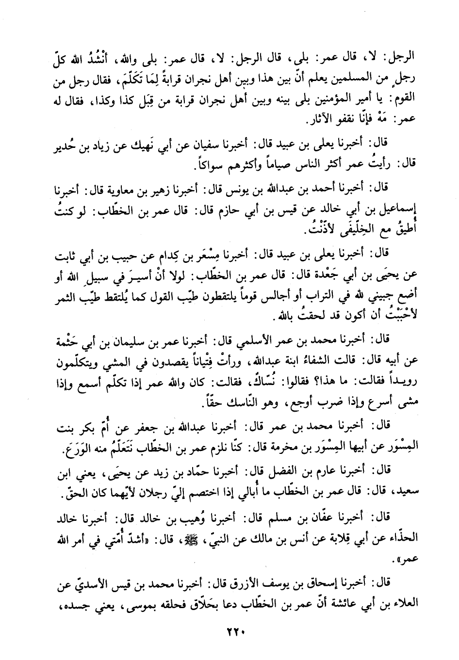 قَالَ: أَخْبَرَنَا مُحَمَّدُ بْنُ عُمَرَ الأَسْلَمِيُّ قَالَ: أَخْبَرَنَا عُمَرُ بْنُ سُلَيْمَانَ بْنِ أَبِي حَثْمَةَ عَنْ أَبِيهِ قَالَ: قَالَتِ الشِّفَاءُ ابْنَةُ عَبْدِ اللَّهِ. وَرَأَتْ فِتْيَانًا يَقْصِدُونَ فِي الْمَشْي وَيَتَكَلَّمُونَ رُوَيْدًا فَقَالَتْ: مَا هَذَا؟ فَقَالُوا: نُسَّاكٌ. فَقَالَتْ: كَانَ وَاللَّهِ عُمَرُ إِذَا تَكَلَّمَ أَسْمَعَ وَإِذَا مَشَى أَسْرَعَ وَإِذَا ضَرَبَ أَوْجَعَ. وَهُوَ النَّاسِكُ حَقًّا.