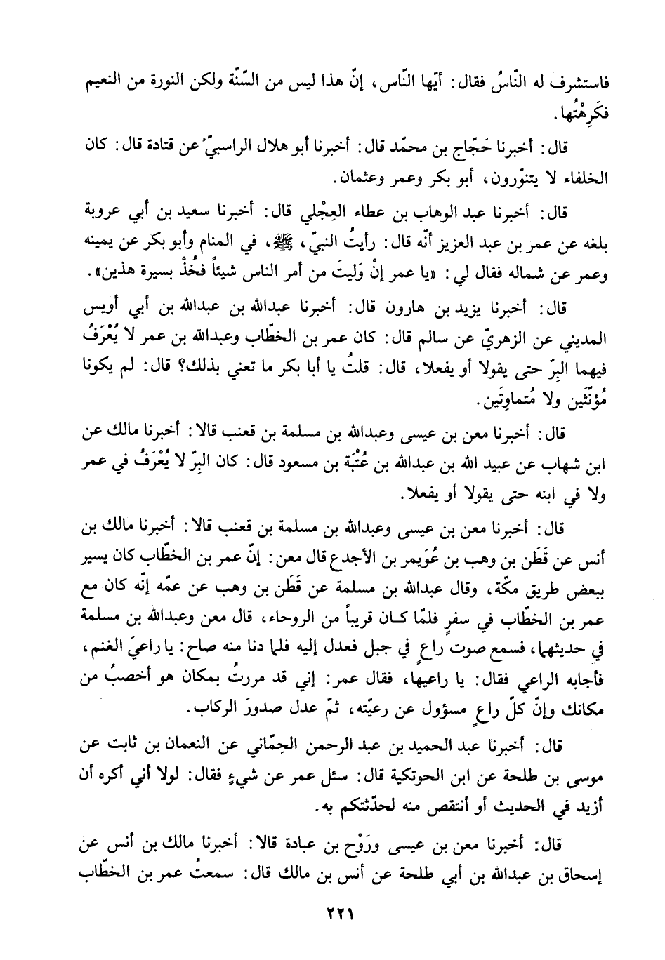 قَالَ: أَخْبَرَنَا مَعْنُ بْنُ عِيسَى وَرَوْحُ بْنُ عُبَادَةَ قَالا: أَخْبَرَنَا مَالِكُ بْنُ أَنَسٍ عَنْ إِسْحَاقَ بْنِ عَبْدِ اللَّهِ بْنِ أَبِي طَلْحَةَ عَنْ أَنَسِ بْنِ مَالِكٍ قَالَ: سَمِعْتُ عُمَرَ بْنَ الْخَطَّابِ