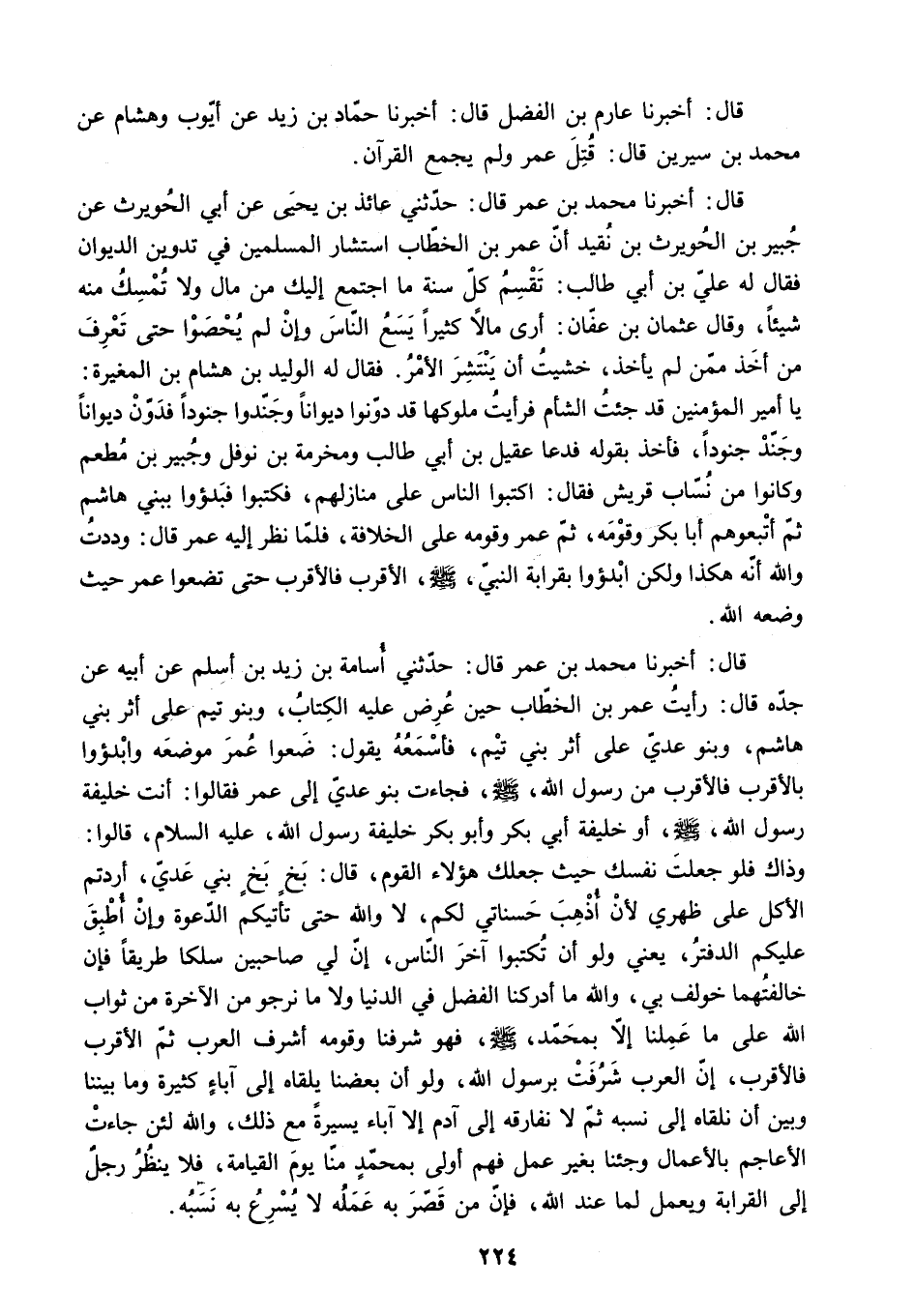 قَالَ: أَخْبَرَنَا مُحَمَّدُ بْنُ عُمَرَ قَالَ: حَدَّثَنِي أُسَامَةُ بْنُ زَيْدِ بْنِ أَسْلَمَ عَنْ أَبِيهِ عَنْ جَدِّهِ قَالَ: رَأَيْتُ عُمَرَ بْنَ الْخَطَّابِ حِينَ عُرِضَ عَلَيْهِ الْكِتَابُ. وَبَنُو تَيْمٍ عَلَى أَثَرِ بَنِي هَاشِمٍ. وَبَنُو عَدِيٍّ عَلَى أَثَرِ بَنِي تَيْمٍ. فَأَسْمَعُهُ يَقُولُ: ضَعُوا عُمَرَ مَوْضِعَهُ وَابْدَءُوا بِالأَقْرَبِ فَالأَقْرَبِ مِنْ رَسُولِ اللَّهِ - صَلَّى اللَّهُ عَلَيْهِ وَسَلَّمَ - فَجَاءَتْ بَنُو عَدِيٍّ إِلَى عُمَرَ فَقَالُوا: أَنْتَ خَلِيفَةُ رَسُولُ اللَّهِ - صَلَّى اللَّهُ عَلَيْهِ وَسَلَّمَ - أَوْ خَلِيفَةُ أَبِي بَكْرٍ وَأَبُو بَكْرٍ خَلِيفَةُ رَسُولِ اللَّهِ. ع. قَالُوا: