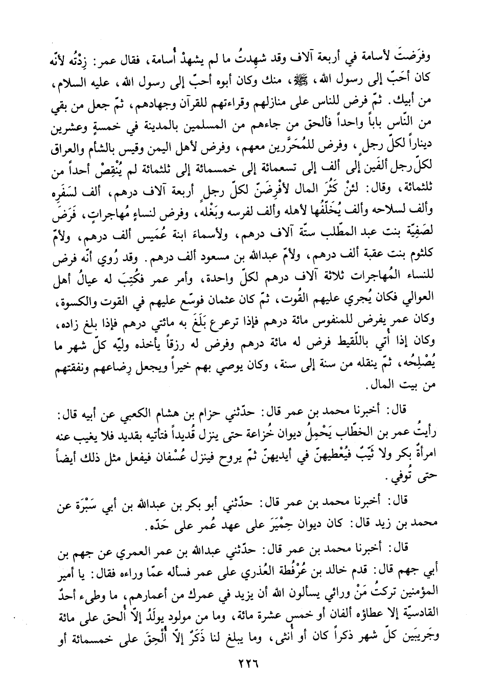 مِنْ أَبِيكَ. ثُمَّ فَرَضَ لِلنَّاسِ عَلَى مَنَازِلِهِمْ وَقِرَاءَتِهِمْ لِلْقُرْآنِ وَجِهَادِهِمْ. ثُمَّ جَعَلَ مَنْ بَقِيَ مِنَ النَّاسِ بَابًا وَاحِدًا فَأَلْحَقَ مَنْ جَاءَهُمْ مِنَ الْمُسْلِمِينَ بِالْمَدِينَةِ فِي خَمْسَةٍ وَعِشْرِينَ دِينَارًا لِكُلِّ رَجُلٍ. وَفَرَضَ لِلْمُحَرَّرِينَ مَعَهُمْ. وَفَرَضَ لأَهْلِ الْيَمَنِ وَقَيْسٍ بِالشَّامِ وَالْعِرَاقِ لِكُلِّ رَجُلٍ أَلْفَيْنِ إِلَى أَلْفٍ إِلَى تِسْعِمِائَةٍ إِلَى خَمْسِمِائَةٍ إِلَى ثَلاثِمِائَةٍ لَمْ يُنْقِصْ أَحَدًا مِنْ ثَلاثِمِائَةٍ. وَقَالَ: لَئِنْ كَثُرَ الْمَالُ لأَفْرِضَنَّ لِكُلِّ رَجُلٍ أَرْبَعَةَ آلافِ دِرْهَمٍ. أَلْفٌ لِسَفَرِهِ وَأَلْفٌ لِسِلاحِهِ وَأَلْفٌ يُخَلِّفُهَا لأَهْلِهِ وَأَلْفٌ لِفَرَسِهِ وَبَغْلِهِ. وَفَرَضَ لِنِسَاءَ مُهَاجِرَاتٍ. فَرَضَ لِصَفِيَّةَ بِنْتِ عَبْدِ الْمُطَّلِبِ سِتَّةَ آلافِ دِرْهَمٍ. وَلأَسْمَاءَ ابْنَةِ عُمَيْسٍ أَلْفَ دِرْهَمٍ. وَلأُمِّ كُلْثُومِ بِنْتِ عُقْبَةَ أَلْفَ دِرْهَمٍ. وَلأُمِّ عَبْدِ اللَّهِ بْنِ مَسْعُودٍ أَلْفَ دِرْهَمٍ. وَقَدْ رُوِيَ أَنَّهُ فَرَضَ لِلنِّسَاءِ الْمُهَاجِرَاتِ ثَلاثَةَ آلافِ دِرْهَمٍ لِكُلِّ وَاحِدَةٍ. وَأَمَرَ عُمَرُ فَكُتِبَ لَهُ عِيَالُ أَهْلِ الْعَوَالِي فَكَانَ يَجْرِي عَلَيْهِمُ الْقُوتَ. ثُمَّ كَانَ عُثْمَانُ فَوَسَّعَ عَلَيْهِمْ فِي الْقُوتِ وَالْكِسْوَةِ.
