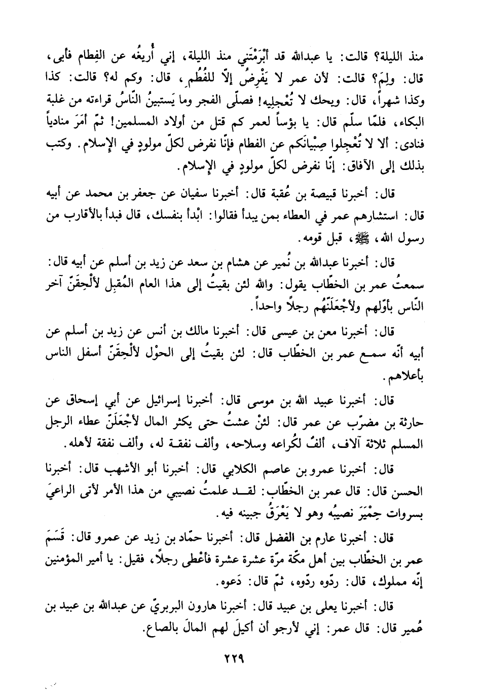 قَالَ: وَلِمَ؟ قَالَتْ: لأَنَّ عُمَرَ لا يَفْرِضُ إِلا لِلْفُطُمِ. قَالَ: وَكَمْ لَهُ؟ قَالَتْ: كَذَا وَكَذَا شَهْرًا. قَالَ: وَيْحَكَ لا تُعْجِلِيهُ! فَصَلَّى الْفَجْرَ وَمَا يَسْتَبِينُ النَّاسُ قِرَاءَتَهُ مِنْ غَلَبَةِ الْبُكَاءِ. فَلَمَّا سَلَّمَ قَالَ: يَا بُؤْسًا لِعُمَرَ كَمْ قَتَلَ مِنْ أَوْلادِ الْمُسْلِمِينَ! ثُمَّ أَمَرَ مُنَادِيًا فَنَادَى: أَلا لا تُعْجِلُوا صِبْيَانَكُمْ عَنِ الْفِطَامِ فَإِنَّا نَفْرِضُ لِكُلِّ مَوْلُودٍ فِي الإِسْلامِ. وَكَتَبَ بِذَلِكَ إِلَى الآفَاقِ: إِنَّا نَفْرِضُ لِكُلِّ مَوْلُودٍ فِي الإِسْلامِ.