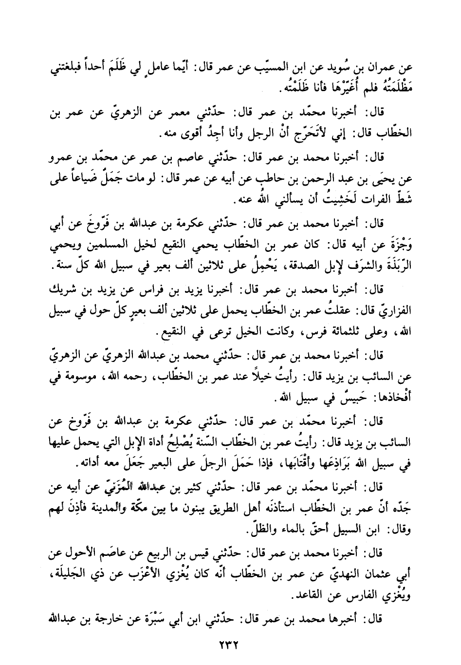 قَالَ: أَخْبَرَنَا مُحَمَّدُ بْنُ عُمَرَ قَالَ: أَخْبَرَنَا يَزِيدُ بْنُ فِرَاسٍ عَنْ يَزِيدَ بْنِ شَرِيكٍ الْفَزَارِيِّ قَالَ: عَقِلْتُ عُمَرَ بْنَ الْخَطَّابِ يَحْمِلُ عَلَى ثَلاثِينَ أَلْفَ بَعِيرٍ كُلَّ حَوْلٍ فِي سَبِيلِ اللَّهِ. وَعَلَى ثَلاثِمِائَةِ فَرَسٍ. وَكَانَتِ الْخَيْلُ تَرْعَى فِي النَّقِيعِ.