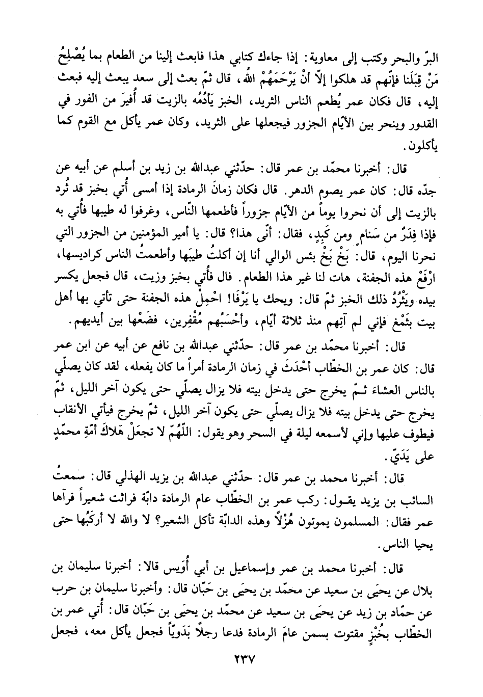 الْبِرِّ وَالْبَحْرِ وَكَتَبَ إِلَى مُعَاوِيَةَ: إِذَا جَاءَكَ كِتَابِي هَذَا فَابْعَثْ إِلَيْنَا مِنَ الطَّعَامِ بِمَا يُصْلِحُ مَنْ قِبَلَنَا فَإِنَّهُمْ قَدْ هَلَكُوا إِلا أَنْ يَرْحَمَهُمُ اللَّهُ. قَالَ ثُمَّ بَعَثَ إِلَى سَعْدٍ يَبْعَثُ إِلَيْهِ فَبَعَثَ إِلَيْهِ. قَالَ فَكَانَ عُمَرُ يُطْعِمُ النَّاسَ الثَّرِيدَ. الْخُبْزَ يَأْدُمُهُ بِالزَّيْتِ قَدْ أُفِيرَ مِنَ الْفَوْرِ فِي الْقُدُورِ وَيَنْحَرُ بَيْنَ الأَيَّامِ الْجَزُورَ فَيَجْعَلُهَا عَلَى الثَّرِيدِ. وَكَانَ عُمَرُ يَأْكُلُ مَعَ الْقَوْمِ كَمَا يَأْكُلُونَ.