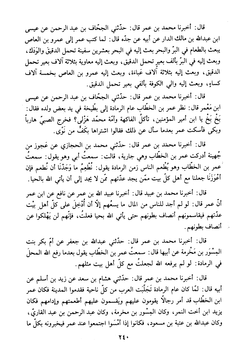 قَالَ: أَخْبَرَنَا مُحَمَّدُ بْنُ عُمَرَ قَالَ: حَدَّثَنِي عَبْدُ اللَّهِ بْنُ جَعْفَرٍ عَنْ أُمِّ بَكْرِ بِنْتِ الْمِسْوَرِ بْنِ مَخْرَمَةَ عَنْ أَبِيهَا قَالَ: سَمِعْتُ عُمَرَ بْنَ الْخَطَّابِ يَقُولُ بعد ما رَفَعَ اللَّهُ الْمَحْلَ فِي الرَّمَادَةِ: لَوْ لَمْ يَرْفَعْهُ اللَّهُ لَجَعَلْتُ مَعَ كُلِّ أَهْلِ بَيْتٍ مَثَلَهُمْ.