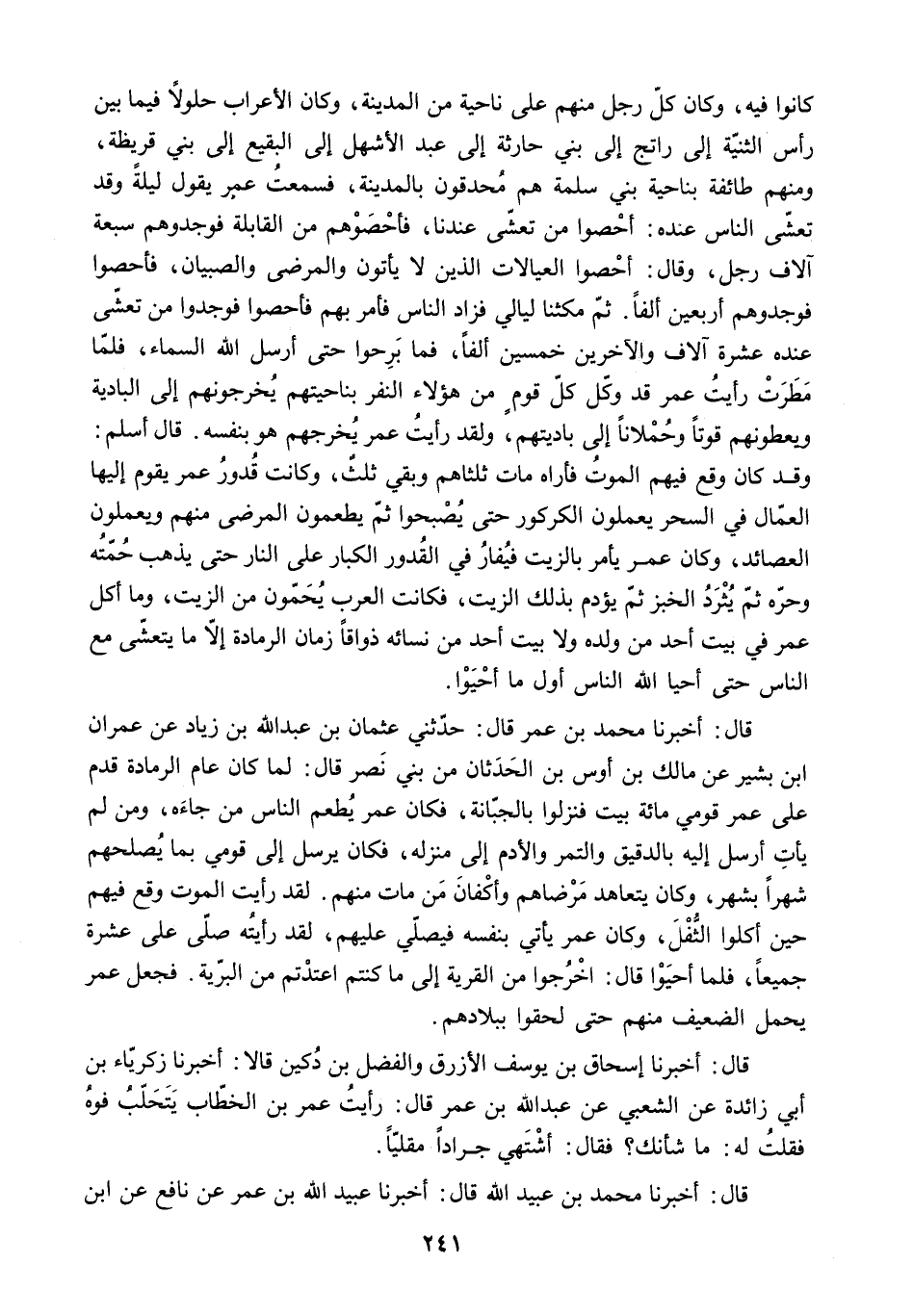 وَقَدْ كَانَ وَقَعَ فِيهِمُ الْمَوْتُ فَأَرَاهُ مَاتَ ثُلُثَاهُمْ وَبَقِيَ ثُلُثٌ. وَكَانَتْ قُدُورُ عُمَرَ يَقُومُ إِلَيْهَا الْعُمَّالُ فِي السَّحَرِ يَعْمَلُونَ الْكُرْكُورَ حَتَّى يُصْبِحُوا ثُمَّ يَطْعَمُونَ الْمَرْضَى مِنْهُمْ وَيَعْمَلُونَ الْعَصَائِدَ. وَكَانَ عُمَرُ يَأْمُرُ بِالزَّيْتِ فَيُفَارُ فِي الْقُدُورِ الْكِبَارِ عَلَى النَّارِ حَتَّى يَذْهَبَ حُمَّتُهُ وَحَرَّهُ ثُمَّ يُثْرَدُ الْخُبْزُ ثُمَّ يُؤْدَمُ بِذَلِكَ الزَّيْتِ. فَكَانَتِ الْعَرَبُ يُحَمُّونَ مِنَ الزَّيْتِ. وَمَا أَكَلَ عُمَرُ فِي بَيْتِ أَحَدٍ مِنْ وَلَدِهِ وَلا بَيْتِ أَحَدٍ مِنْ نِسَائِهِ ذَوَاقًا زَمَانَ الرَّمَادَةِ إِلا مَا يَتَعَشَّى مَعَ النَّاسِ حَتَّى أَحْيَا اللَّهُ النَّاسَ أَوَّلَ مَا أَحْيَوْا.
