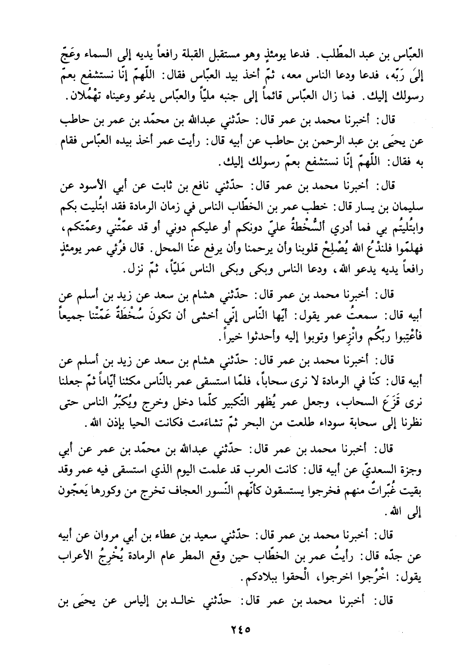 الْعَبَّاسُ بْنُ عَبْدِ الْمُطَّلِبِ. فَدَعَا يَوْمَئِذٍ وَهُوَ مُسْتَقْبِلُ الْقِبْلَةِ رَافِعًا يَدَيْهِ إِلَى السَّمَاءِ وَعَجَّ إِلَى رَبِّهِ. فَدَعَا وَدَعَا النَّاسُ مَعَهُ. ثُمَّ أَخَذَ بِيَدِ الْعَبَّاسِ فَقَالَ: اللَّهُمَّ إِنَّا نَسْتَشْفِعُ بِعَمِّ رَسُولِكَ إِلَيْكَ. فَمَا زَالَ الْعَبَّاسُ قَائِمًا إِلَى جَنْبِهِ مَلِيًّا وَالْعَبَّاسُ يَدْعُو وَعَيْنَاهُ تَهْمُلانِ.