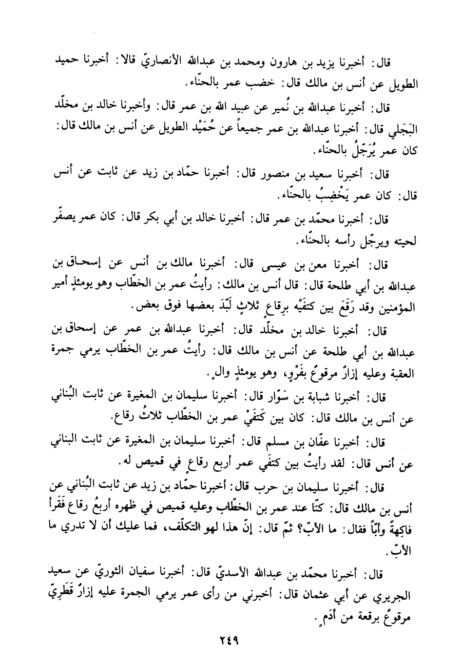 قَالَ: أَخْبَرَنَا يَزِيدُ بْنُ هَارُونَ وَمُحَمَّدُ بْنُ عَبْدِ اللَّهِ الأَنْصَارِيُّ قَالا: أَخْبَرَنَا حُمَيْدٌ الطَّوِيلُ عَنْ أَنَسِ بْنِ مَالِكٍ قَالَ: خَضَبَ عُمَرُ بِالْحِنَّاءِ.