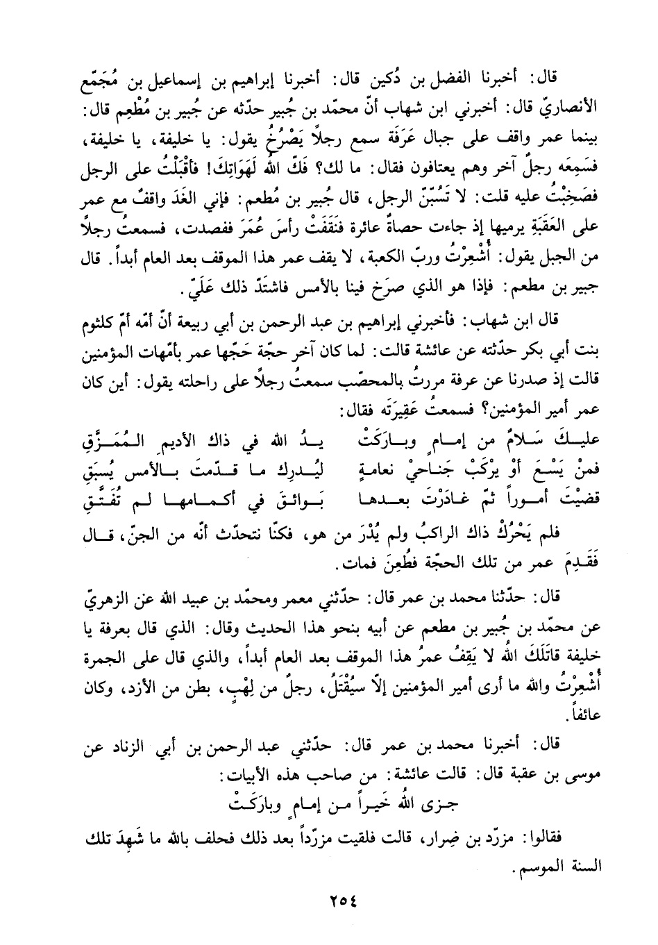 فَسَمِعَهُ رَجُلٌ آخِرَ وَهُمْ يَعْتَافُونَ فَقَالَ: مَا لَكَ؟ فَكَّ اللَّهُ لَهَوَاتِكَ! فَأَقْبَلْتُ عَلَى الرَّجُلِ فَصَخِبْتُ عَلَيْهِ قُلْتُ: لا تَسُبَّنَّ الرَّجُلَ. قَالَ جُبَيْرُ بْنُ مُطْعِمٍ: فَإِنِّي الْغَدَ وَاقِفٌ مَعَ عُمَرَ عَلَى الْعَقَبَةِ يَرْمِيهَا إِذْ جَاءَتْ حَصَاةٌ عَائِرَةٌ فَنَقَفَتْ رَأْسَ عُمَرَ فَفُصِدَتْ. فَسَمِعْتُ رَجُلا مِنَ الْجَبَلِ يَقُولُ: أُشْعِرْتُ وَرَبِّ الْكَعْبَةِ. لا يَقِفُ عُمَرُ هَذَا الْمَوْقِفَ بَعْدَ الْعَامِ أَبَدًا. قَالَ جُبَيْرُ بْنُ مُطْعِمٍ: فَإِذَا هُوَ الَّذِي صَرَخَ فِينَا بِالأَمْسِ فَاشْتَدَّ ذَلِكَ عَلَيَّ. قَالَ ابْنُ شِهَابٍ: فَأَخْبَرَنِي إِبْرَاهِيمُ بْنُ عَبْدِ الرَّحْمَنِ بْنِ أَبِي رَبِيعَةَ أَنَّ أُمَّهُ أُمَّ كُلْثُومِ بِنْتَ أَبِي بَكْرٍ حَدَّثَتْهُ عَنْ عَائِشَةَ قَالَتْ: لَمَّا كَانَ آخِرُ حَجَّةٍ حَجَّهَا عُمَرُ بِأُمَّهَاتِ الْمُؤْمِنِينَ قَالَتْ إِذْ صَدَرْنَا عَنْ عَرَفَةَ مَرَرْتُ بِالْمُحَصَّبِ سَمِعْتُ رَجُلا عَلَى رَاحِلَتِهِ يَقُولُ: أَيْنَ كَانَ عمر أمير المؤمنين؟ فسمعت عَقِيرَتَهُ فَقَالَ: