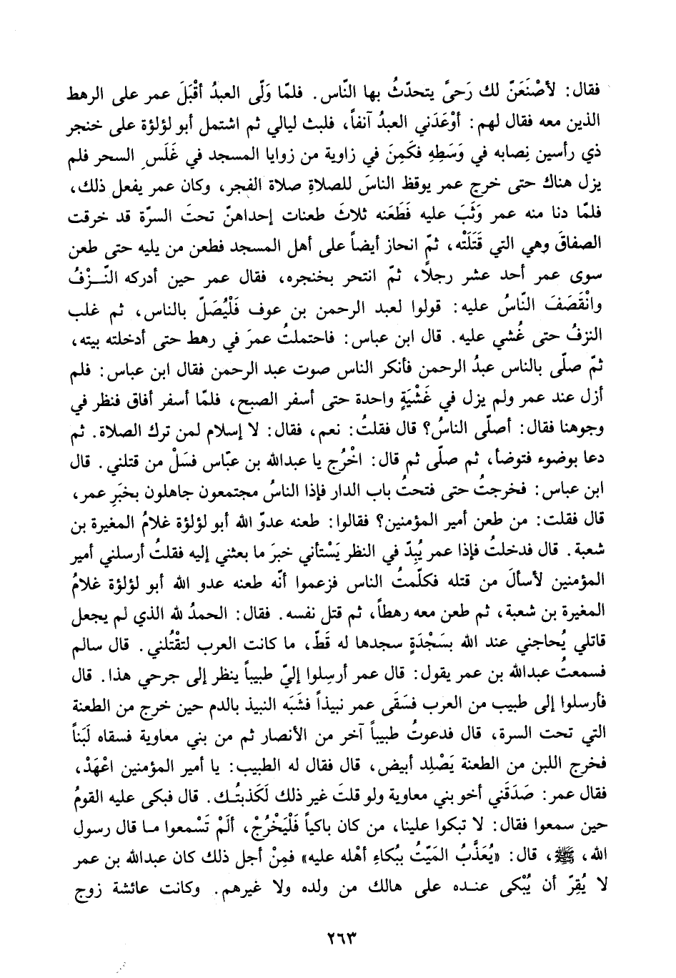 ثُمَّ صَلَّى بِالنَّاسِ عَبْدُ الرَّحْمَنِ فَأَنْكَرَ النَّاسُ صَوْتَ عَبْدِ الرَّحْمَنِ فَقَالَ ابْنُ عَبَّاسٍ: فَلَمْ أَزَلْ عِنْدَ عُمَرَ وَلَمْ يَزَلْ فِي غَشْيَةٍ وَاحِدَةٍ حَتَّى أَسْفَرَ الصُّبْحُ. فَلَمَّا أَسْفَرَ أَفَاقَ فَنَظَرَ فِي وُجُوهِنَا فَقَالَ: أَصَلَّى النَّاسُ؟ قَالَ فَقُلْتُ: نَعَمْ. فَقَالَ: لا إِسْلامَ لِمَنْ تَرَكَ الصَّلاةَ. ثُمَّ دَعَا بِوَضُوءٍ فَتَوَضَّأَ. ثُمَّ صَلَّى ثُمَّ قَالَ: اخْرُجْ يَا عَبْدَ اللَّهِ بْنَ عَبَّاسٍ فَسَلْ مَنْ قَتَلَنِي. قَالَ ابْنُ عَبَّاسٍ: فَخَرَجْتُ حَتَّى فَتَحْتُ بَابَ الدَّارِ فَإِذَا النَّاسُ مُجْتَمِعُونَ جَاهِلُونَ بِخَبَرِ عُمَرَ.