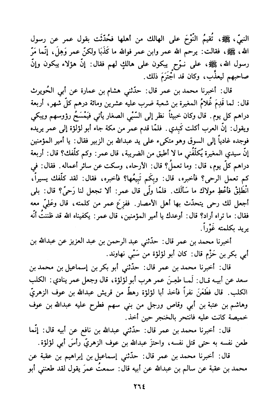 قَالَ: أَخْبَرَنَا مُحَمَّدُ بْنُ عُمَرَ قَالَ: حَدَّثَنِي هِشَامُ بْنُ عُمَارَةَ عَنْ أَبِي الْحُوَيْرِثِ قَالَ: لَمَّا قَدِمَ غُلامُ الْمُغِيرَةِ بْنُ شُعْبَةَ ضَرَبَ عَلَيْهِ عِشْرِينَ وَمِائَةَ دِرْهَمٍ كُلَّ شَهْرٍ. أَرْبَعَةَ دَرَاهِمٍ كُلَّ يَوْمٍ. قَالَ وَكَانَ خبيثا نظر إلى السبي الصغار يأتي فيمسح رؤوسهم وَيَبْكِي وَيَقُولُ: إِنَّ الْعَرَبَ أَكَلَتْ كَبِدِي. فَلَمَّا قَدِمَ عُمَرُ مِنْ مَكَّةَ جَاءَ أَبُو لُؤْلُؤَةَ إِلَى عُمَرَ يُرِيدُهُ فَوَجَدَهُ غَادِيًا إِلَى السُّوقِ وَهُوَ مُتَّكِئٌ عَلَى يَدِ عَبْدِ اللَّهِ بْنِ الزُّبَيْرِ فَقَالَ: يَا أَمِيرَ الْمُؤْمِنِينَ إِنَّ سَيِّدِي الْمُغِيرَةِ يُكَلِّفُنِي مَا لا أُطِيقُ مِنَ الضَّرِيبَةِ. قَالَ عُمَرُ: وَكَمْ كَلَّفَكَ؟ قَالَ: أَرْبَعَةُ دَرَاهِمٍ كُلَّ يَوْمٍ. قَالَ: وَمَا تَعْمَلُ؟ قَالَ: الأَرْحَاءُ. وَسَكَتَ عَنْ سَائِرِ أَعْمَالِهِ. فَقَالَ: فِي كَمْ تَعْمَلِ الرَّحَى؟ فَأَخْبَرَهُ. قَالَ: وَبِكَمْ تَبِيعُهَا؟ فَأَخْبَرَهُ. فَقَالَ: لَقَدْ كَلَّفَكَ يَسِيرًا.