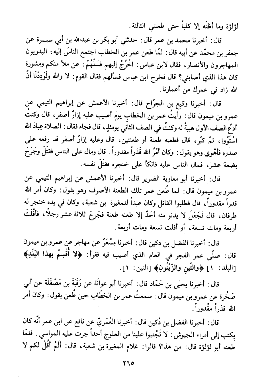 قَالَ: أَخْبَرَنَا الْفَضْلُ بْنُ دُكَيْنٍ قَالَ: أَخْبَرَنَا مِسْعَرٌ عَنْ مُهَاجِرٍ عَنْ عَمْرِو بْنِ مَيْمُونٍ قَالَ: صَلَّى عُمَرُ الْفَجْرَ فِي الْعَامِ الَّذِي أُصِيبَ فِيهِ فَقَرَأَ: «لا أُقْسِمُ بِهذَا الْبَلَدِ» البلد: 1 «وَالتِّينِ وَالزَّيْتُونِ» التين: 1.