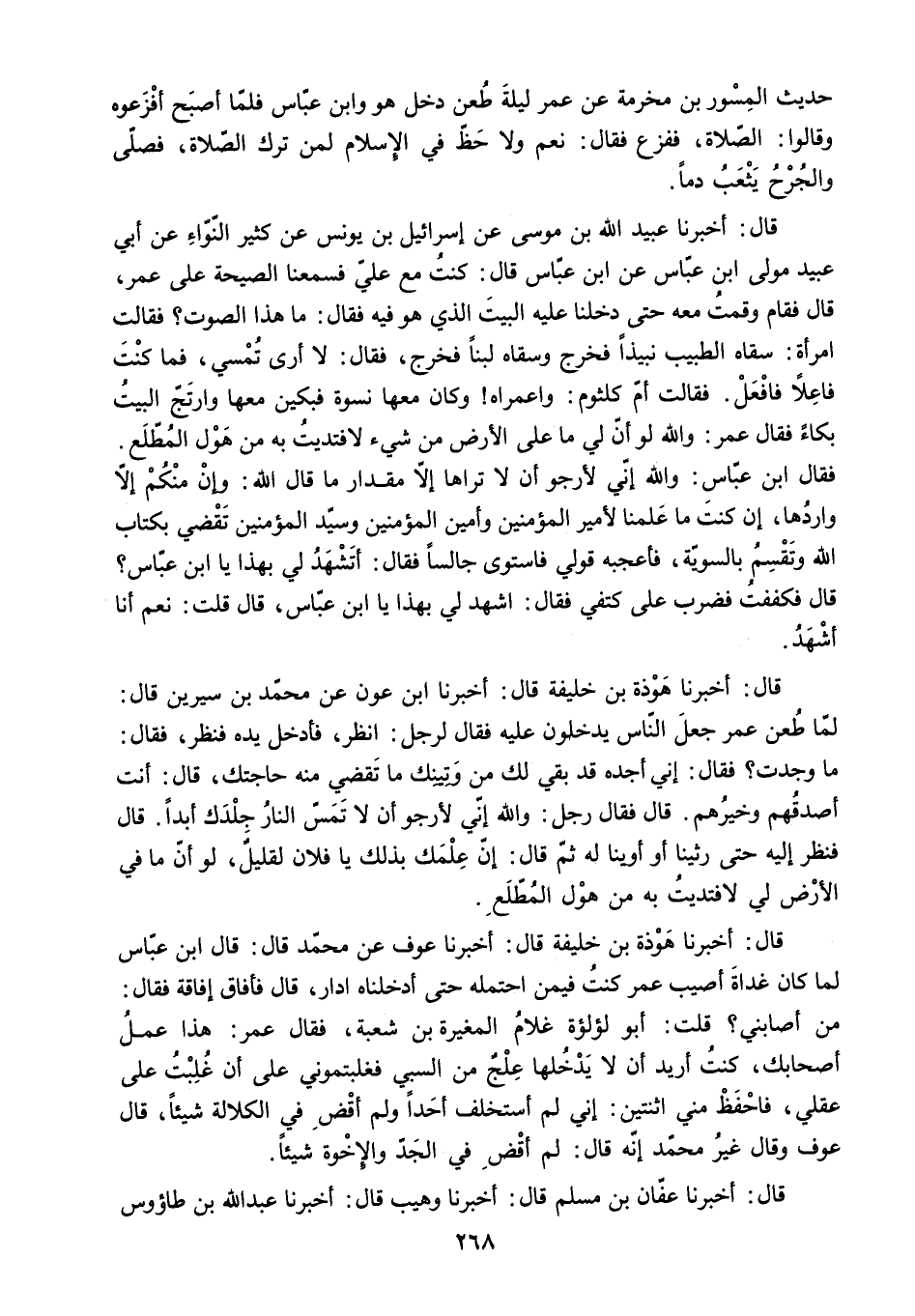 قَالَ: أَخْبَرَنَا هَوْذَةُ بْنُ خَلِيفَةَ قَالَ: أَخْبَرَنَا عَوْفٌ عَنْ مُحَمَّدٍ قَالَ: قَالَ ابْنُ عَبَّاسٍ لَمَّا كَانَ غَدَاةَ أُصِيبَ عُمَرُ كُنْتُ فِيمَنِ احْتَمَلَهُ حَتَّى أَدْخَلْنَاهُ الدَّارَ. قَالَ فَأَفَاقَ إِفَاقَةً فَقَالَ: