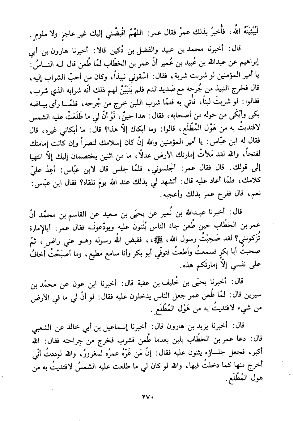 قَالَ: أَخْبَرَنَا يَزِيدُ بْنُ هَارُونَ قَالَ: أَخْبَرَنَا إِسْمَاعِيلَ بْنِ أَبِي خَالِدٍ عَنِ الشَّعْبِيِّ قَالَ: دَعَا عُمَرُ بْنُ الْخَطَّابِ بِلَبَنٍ بعد ما طُعِنَ فَشَرِبَ فَخَرَجَ مِنْ جِرَاحَتِهِ فَقَالَ: اللَّهُ أَكْبَرُ. فَجَعَلَ جُلَسَاؤُهُ يُثْنُونَ عَلَيْهِ فَقَالَ: إِنَّ مَنْ غَرَّهُ عُمُرُهُ لَمَغْرُورٌ. وَاللَّهِ لَوَدِدْتُ أَنِّي أَخْرُجُ مِنْهَا كَمَا دَخَلْتُ فِيهَا. وَاللَّهِ لَوْ كَانَ لِي مَا طَلَعَتْ عَلَيْهِ الشَّمْسُ لافْتَدَيْتُ بِهِ مِنْ هَوْلِ الْمُطَّلَعِ.