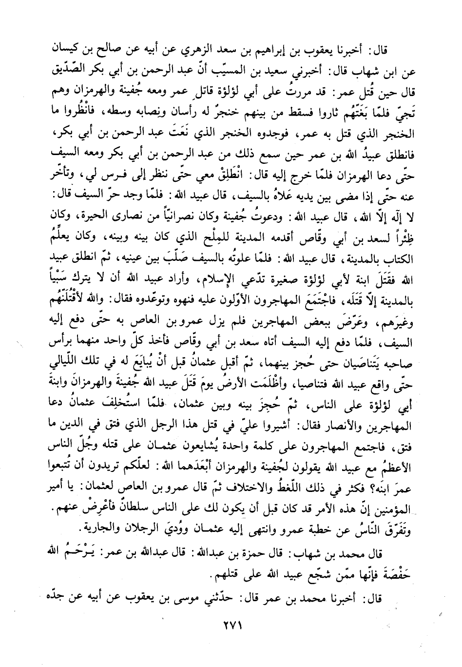 قَالَ: أَخْبَرَنَا يَعْقُوبُ بْنُ إِبْرَاهِيمَ بْنِ سَعْدٍ الزُّهْرِيُّ عَنْ أَبِيهِ عَنْ صَالِحِ بْنِ كَيْسَانَ عَنِ ابْنِ شِهَابٍ قَالَ: أَخْبَرَنِي سَعِيدُ بْنُ الْمُسَيِّبِ أَنَّ عَبْدَ الرَّحْمَنِ بْنَ أَبِي بَكْرٍ الصِّدِّيقِ قَالَ حِينَ قُتِلَ عُمَرُ: قَدْ مَرَرْتُ عَلَى أَبِي لُؤْلُؤَةَ قَاتَلِ عُمَرَ وَمَعَهُ جُفَيْنَةُ والهرمزان وهم تجي فَلَمَّا بَغَتُّهُمْ ثَارُوا فَسَقَطَ مِنْ بَيْنِهِمْ خِنْجَرٌ لَهُ رَأْسَانِ وَنِصَابُهُ وَسَطُهُ. فَانْظُرُوا مَا الْخِنْجَرُ الَّذِي قُتِلَ بِهِ عُمَرُ. فَوَجَدُوهُ الْخِنْجَرَ الَّذِي نَعَتَ عَبْدُ الرَّحْمَنِ بْنُ أَبِي بَكْرٍ.
