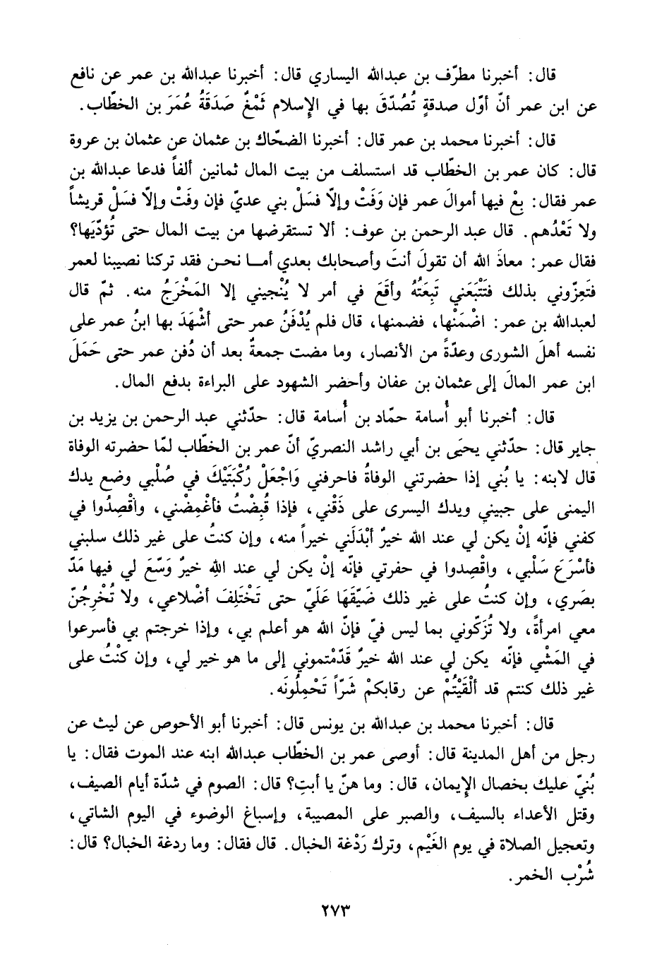قَالَ: أَخْبَرَنَا أَبُو أُسَامَةَ حَمَّادُ بْنُ أُسَامَةَ قَالَ: حَدَّثَنِي عَبْدُ الرَّحْمَنِ بْنُ يَزِيدَ بْنِ جَابِرٍ قَالَ: حَدَّثَنِي يَحْيَى بْنُ أَبِي رَاشِدٍ النَّصْرِيُّ أَنَّ عُمَرَ بْنَ الْخَطَّابِ لَمَّا حَضَرَتْهُ الْوَفَاةُ قَالَ لابْنِهِ: يَا بُنَيَّ إِذَا حَضَرَتْنِي الْوَفَاةُ فَاحْرِفْنِي وَاجْعَلْ رُكْبَتَيْكَ فِي صُلْبِي وَضَعْ يَدَكَ الْيُمْنَى عَلَى جَبِينِي وَيَدَكَ الْيُسْرَى عَلَى ذَقْنِي. فَإِذَا قُبِضْتُ فَأَغْمِضْنِي. وَاقْصِدُوا فِي كَفَنِي فَإِنَّهُ إِنْ يَكُنْ لِي عِنْدَ اللَّهِ خَيْرٌ أَبْدَلَنِي خَيْرًا مِنْهُ. وَإِنْ كُنْتُ عَلَى غَيْرِ ذَلِكَ سَلَبَنِي فَأَسْرَعَ سَلْبِي. وَاقْصِدُوا فِي حُفْرَتِي فَإِنَّهُ إِنْ يَكُنْ لِي عِنْدَ اللَّهِ خَيْرٌ وَسَّعَ لِي فِيهَا مَدَّ بَصَرِي. وَإِنْ كُنْتُ عَلَى غَيْرِ ذَلِكَ ضَيَّقَهَا عَلَيَّ حَتَّى تَخْتَلِفُ أَضْلاعِي. وَلا تُخْرِجُنَّ مَعِي امْرَأَةً. وَلا تُزَكُّونِي بِمَا لَيْسَ فِيَّ فَإِنَّ اللَّهَ هُوَ أَعْلَمُ بِي. وَإِذَا خَرَجْتُمْ بِي فأسرعوا في المشي فإنه يَكُنْ لِي عِنْدَ اللَّهِ خَيْرٌ قَدَّمْتُمُونِي إِلَى مَا هُوَ خَيْرٌ لِي. وَإِنْ كُنْتُ عَلَى غَيْرِ ذَلِكَ كُنْتُمْ قَدْ أَلْقَيْتُمْ عَنْ رِقَابِكُمْ شَرًّا تَحْمِلُونَهُ.