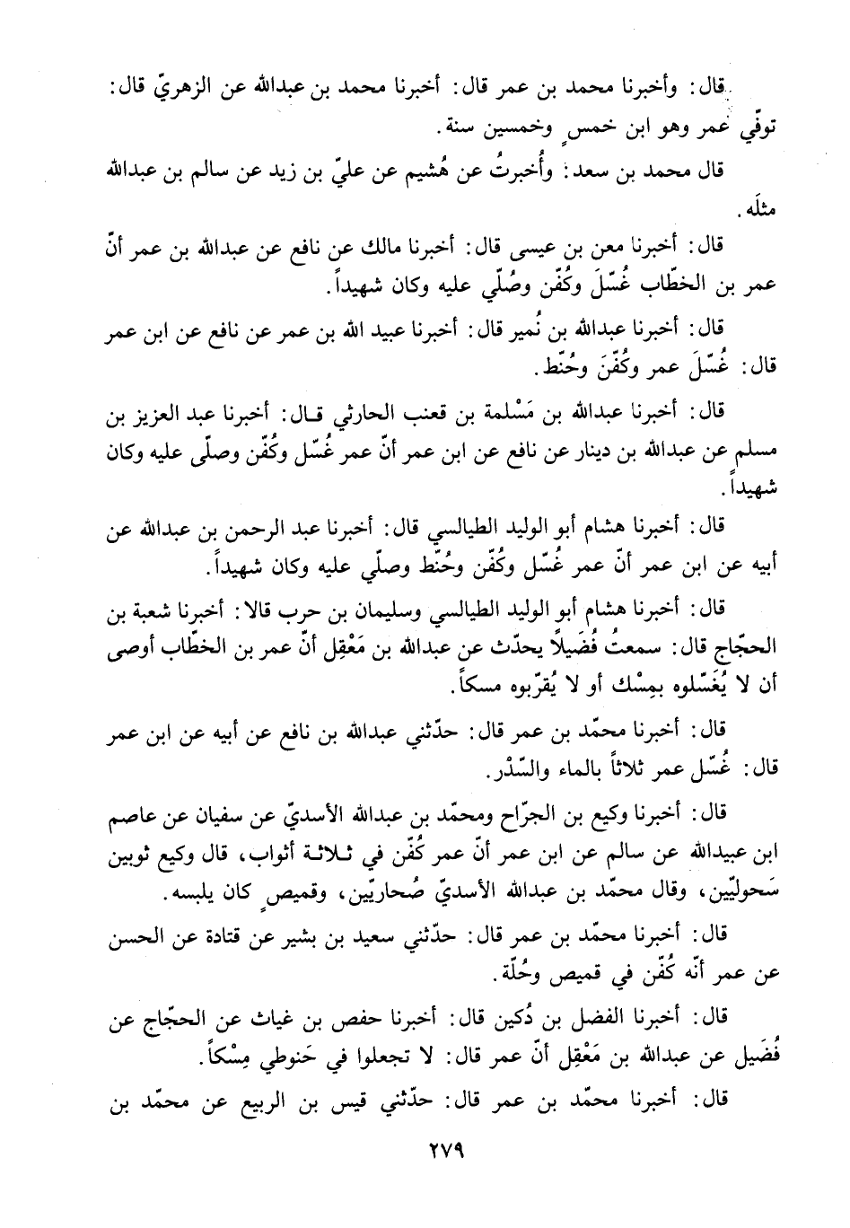 قَالَ: أَخْبَرَنَا هِشَامٌ أَبُو الْوَلِيدِ الطَّيَالِسِيُّ قَالَ: أَخْبَرَنَا عَبْدُ الرَّحْمَنِ بْنُ عَبْدِ اللَّهِ عَنْ أَبِيهِ عَنِ ابْنِ عُمَرَ أَنَّ عُمَرَ غُسِّلَ وَكُفِّنَ وَحُنِّطَ وَصُلِّيَ عَلَيْهِ وَكَانَ شَهِيدًا.