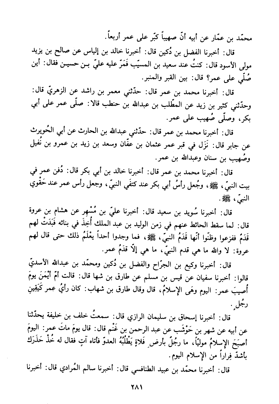 قَالَ: أَخْبَرَنَا مُحَمَّدُ بْنُ عُمَرَ قَالَ: أَخْبَرَنَا خَالِدُ بْنُ أَبِي بَكْرٍ قَالَ: دُفِنَ عُمَرُ فِي بَيْتِ النَّبِيِّ - صَلَّى اللَّهُ عَلَيْهِ وَسَلَّمَ - وَجُعِلَ رَأْسُ أَبِي بَكْرٍ عِنْدَ كَتِفَيِ النَّبِيِّ. وَجُعِلَ رَأْسُ عُمَرَ عِنْدَ حَقْوَيِ النَّبِيِّ - صَلَّى اللَّهُ عَلَيْهِ وَسَلَّمَ -