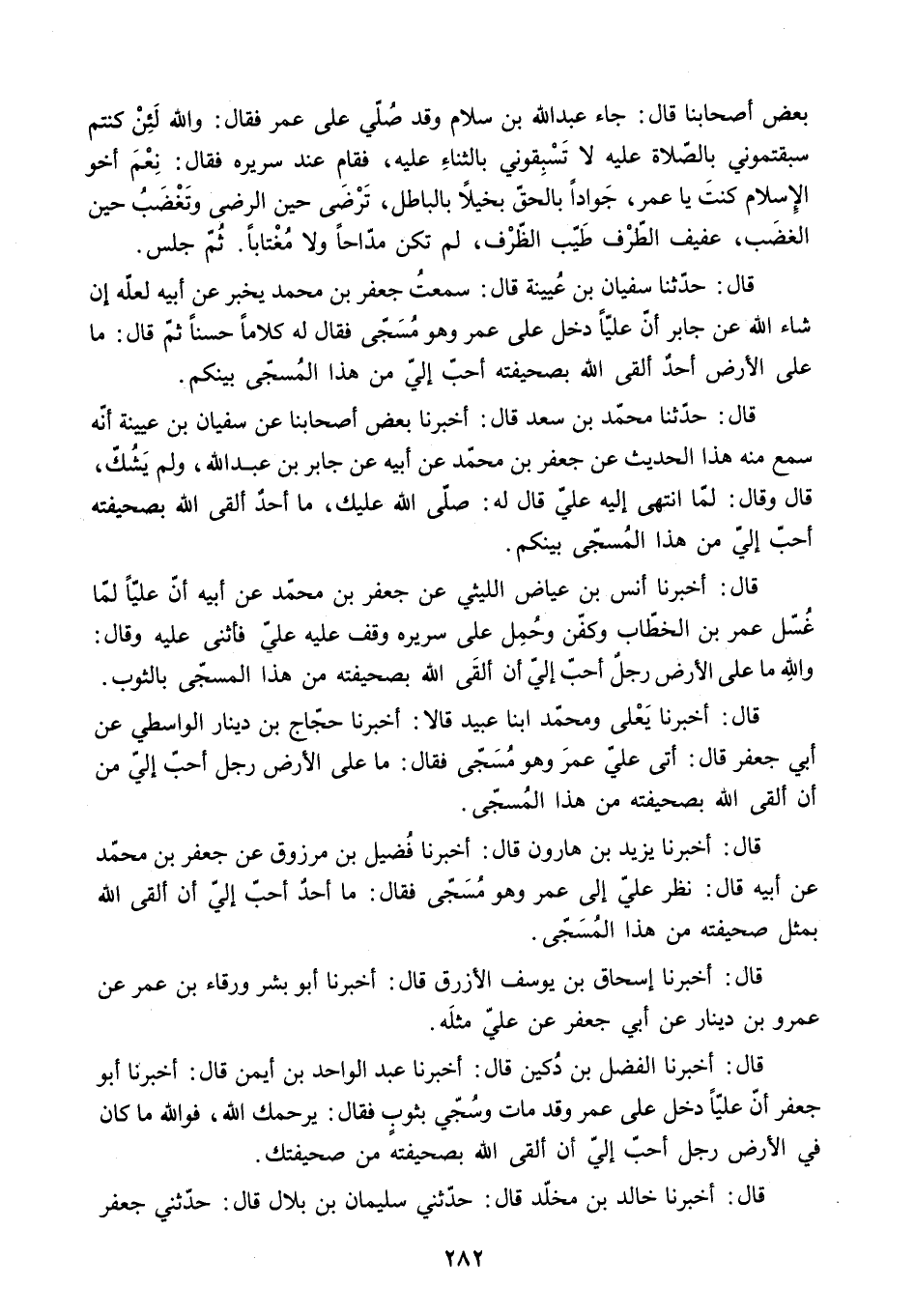 قَالَ: أَخْبَرَنَا يَزِيدُ بْنُ هَارُونَ قَالَ: أَخْبَرَنَا فُضَيْلُ بْنُ مَرْزُوقٍ عَنْ جَعْفَرِ بْنِ مُحَمَّدٍ عَنْ أَبِيهِ قَالَ: [نَظَرَ عَلِيٌّ إِلَى عُمَرَ وَهُوَ مُسَجًّى فَقَالَ: مَا أَحَدٌ أَحَبُّ إِلَيَّ أَنْ أَلْقَى اللَّهَ بِمِثْلِ صَحِيفَتِهِ مِنْ هَذَا الْمُسَجَّى] .