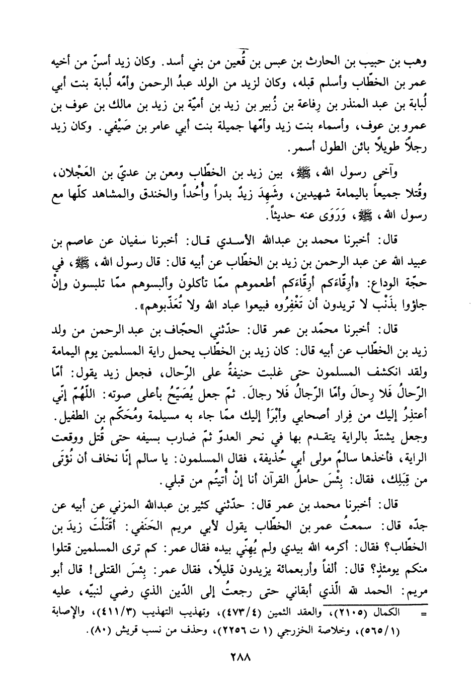 قَالَ: أَخْبَرَنَا مُحَمَّدُ بْنُ عُمَرَ قَالَ: حَدَّثَنِي الْحَجَّافُ بْنُ عَبْدِ الرَّحْمَنِ مِنْ وَلَدِ زَيْدِ بْنِ الْخَطَّابِ عَنْ أَبِيهِ قَالَ: كَانَ زَيْدُ بْنُ الْخَطَّابِ يَحْمِلُ رَايَةَ الْمُسْلِمِينَ يَوْمَ الْيَمَامَةِ وَلَقَدِ انْكَشَفَ الْمُسْلِمُونَ حَتَّى غَلَبَتْ حَنِيفَةُ عَلَى الرِّحَالِ. فَجَعَلَ زَيْدٌ يَقُولُ: أَمَّا الرِّحَالُ فَلا رِحَالَ وَأَمَّا الرِّجَالُ فَلا رِجَالَ. ثُمَّ جَعَلَ يَصِيحُ بِأَعْلَى صَوْتِهِ: اللَّهُمَّ إِنِّي أَعْتَذِرُ إِلَيْكَ مِنْ فِرَارِ أَصْحَابِي وَأَبْرَأُ إِلَيْكَ مِمَّا جَاءَ بِهِ مُسَيْلِمَةُ وَمُحَكَّمُ بْنُ الطُّفَيْلِ.