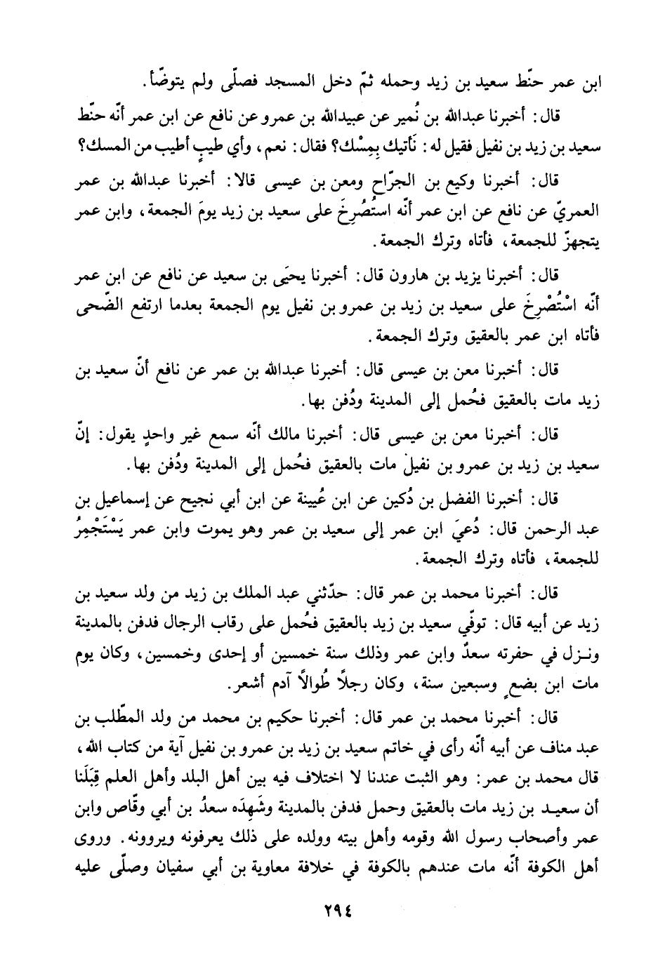قَالَ: أَخْبَرَنَا مُحَمَّدُ بْنُ عُمَرَ قَالَ: حَدَّثَنِي عَبْدُ الْمَلِكِ بْنُ زَيْدٍ مِنْ وَلَدِ سَعِيدِ بْنِ زَيْدٍ عَنْ أَبِيهِ قَالَ: تُوُفِّيَ سَعِيدُ بْنُ زَيْدٍ بِالْعَقِيقِ فَحُمِلَ عَلَى رِقَابِ الرِّجَالِ فَدُفِنَ بِالْمَدِينَةِ وَنَزَلَ فِي حُفْرَتِهِ سَعْدٌ وَابْنُ عُمَرَ وَذَلِكَ سَنَةَ خَمْسِينَ أَوْ إِحْدَى وَخَمْسِينَ. وَكَانَ يَوْمَ مَاتَ ابْنُ بِضْعٍ وَسَبْعِينَ سَنَةً. وَكَانَ رَجُلا طُوَالا آدَمَ أَشْعَرَ.