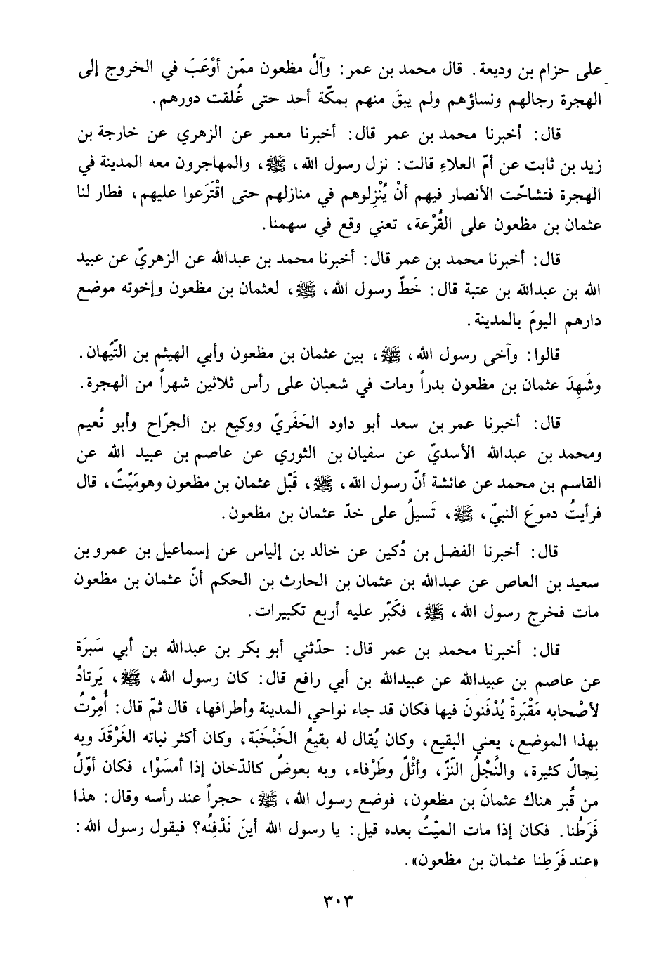 [قَالَ: أَخْبَرَنَا مُحَمَّدُ بْنُ عُمَرَ قَالَ: حَدَّثَنِي أَبُو بَكْرِ بْنُ عَبْدِ اللَّهِ بْنِ أَبِي سَبْرَةَ عَنْ عَاصِمِ بْنِ عُبَيْدِ اللَّهِ عَنْ عُبَيْدِ اللَّهِ بْنِ أَبِي رَافِعٍ قَالَ: كَانَ رَسُولُ اللَّهِ - صَلَّى اللَّهُ عَلَيْهِ وَسَلَّمَ - يَرْتَادُ لأَصْحَابِهِ مَقْبَرَةً يُدْفَنُونَ فِيهَا فَكَانَ قَدْ جَاءَ نَوَاحِي الْمَدِينَةِ وَأَطْرَافِهَا. قَالَ ثُمَّ قَالَ: أُمِرْتُ بِهَذَا الْمَوْضِعِ. يَعْنِي الْبَقِيعَ. وَكَانَ يُقَالُ لَهُ بَقِيعُ الْخَبْخَبَةِ. وَكَانَ أَكْثَرُ نَبَاتِهِ الْغَرْقَدَ وَبِهِ نِجَالٌ كَثِيرَةٌ. وَالنَّجْلُ النَّزُّ. وَأَثْلٌ وَطَرْفَاءُ. وَبِهِ بَعُوضٌ كَالدُّخَانِ إِذَا أَمْسَوْا. فَكَانَ أَوَّلُ مَنْ قُبِرَ هُنَاكَ عُثْمَانُ بْنُ مَظْعُونٍ. فَوَضَعَ رَسُولُ اللَّهِ - صَلَّى اللَّهُ عَلَيْهِ وَسَلَّمَ - حَجَرًا عِنْدَ رَأْسِهِ وَقَالَ: هَذَا فَرَطُنَا. فَكَانَ إِذَا مَاتَ الْمَيِّتُ بَعْدَهُ قِيلَ: يَا رَسُولَ اللَّهِ أَيْنَ نَدْفِنُهُ؟ فَيَقُولُ رَسُولُ اللَّهِ: