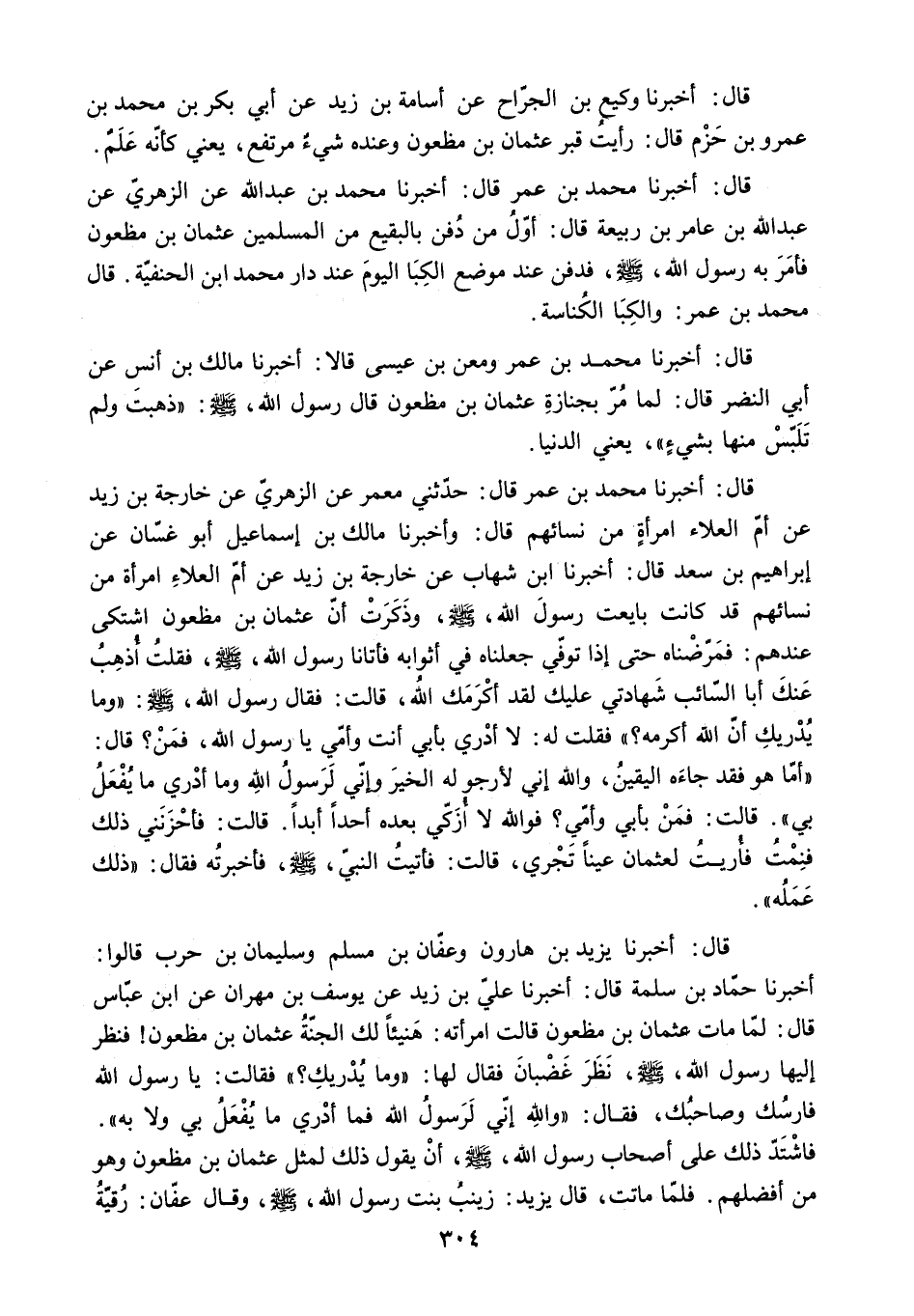 [قَالَ: أَخْبَرَنَا مُحَمَّدُ بْنُ عُمَرَ قَالَ: حَدَّثَنِي معمر عن الزهري عن خارجة بن زيد عَنْ أُمِّ الْعَلاءِ امْرَأَةٍ مِنْ نِسَائِهِمْ قَالَ: وَأَخْبَرَنَا مَالِكُ بْنُ إِسْمَاعِيلَ أَبُو غَسَّانَ عَنْ إِبْرَاهِيمَ بْنِ سَعْدٍ قَالَ: أَخْبَرَنَا ابْنُ شِهَابٍ عَنْ خَارِجَةَ بْنِ زَيْدٍ عَنْ أُمِّ الْعَلاءِ امْرَأَةٍ مِنْ نِسَائِهِمْ قَدْ كَانَتْ بَايَعَتْ رَسُولَ اللَّهِ - صَلَّى اللَّهُ عَلَيْهِ وَسَلَّمَ - وَذَكَرَتْ أَنَّ عُثْمَانَ بْنَ مَظْعُونٍ اشْتَكَى عِنْدَهُمْ: فَمَرَّضْنَاهُ حَتَّى إِذَا تُوُفِّيَ جَعَلْنَاهُ فِي أَثْوَابِهِ فَأَتَانَا رَسُولُ اللَّهِ - صَلَّى اللَّهُ عَلَيْهِ وَسَلَّمَ - فَقُلْتُ أُذْهِبُ عَنْكَ أَبَا السَّائِبِ شَهَادَتِي عَلَيْكَ لَقَدْ أَكْرَمَكَ الله. قالت: فقال رسول الله. ص: وَمَا يُدْرِيكِ أَنَّ اللَّهَ أَكْرَمَهُ؟ فَقُلْتُ لَهُ: لا أَدْرِي بِأَبِي أَنْتَ وَأُمِّي يَا رَسُولَ اللَّهِ. فَمَنْ؟ قَالَ: