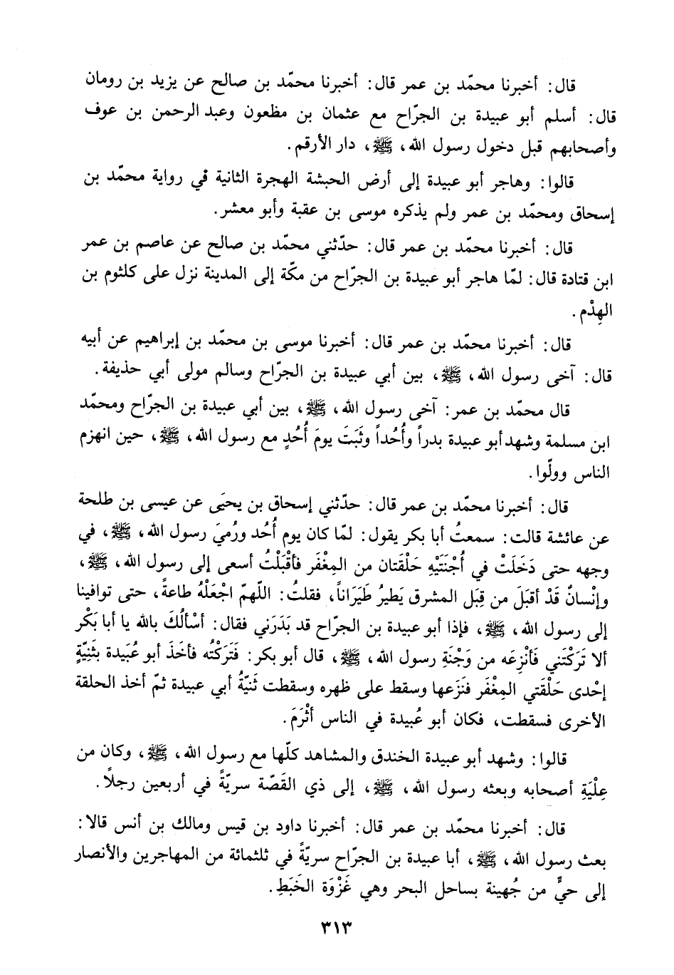 قَالَ محمد بن عمر: آخى رَسُولُ اللَّهِ - صَلَّى اللَّهُ عَلَيْهِ وَسَلَّمَ - بَيْنَ أبي عبيدة بن الجراح ومحمد ابن مَسْلَمَةَ وَشَهِدَ أَبُو عُبَيْدَةَ بَدْرًا وَأُحُدًا وَثَبَتَ يَوْمَ أُحُدٍ مَعَ رَسُولِ اللَّهِ - صَلَّى اللَّهُ عَلَيْهِ وَسَلَّمَ - حِينَ انْهَزَمَ النَّاسُ وَوَلَّوْا.