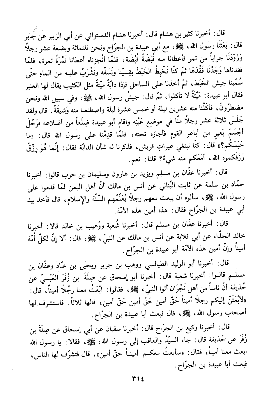 قَالَ: أَخْبَرَنَا عَفَّانُ بْنُ مُسْلِمٍ وَيَزِيدُ بْنُ هَارُونَ وَسُلَيْمَانُ بْنُ حَرْبٍ قَالُوا: أَخْبَرَنَا حَمَّادُ بْنُ سَلَمَةَ عَنْ ثَابِتٍ الْبُنَانِيِّ عَنْ أَنَسِ بْنِ مَالِكٍ أَنَّ أَهْلَ الْيَمَنِ لَمَّا قَدِمُوا عَلَى رَسُولِ اللَّهِ - صَلَّى اللَّهُ عَلَيْهِ وَسَلَّمَ - سَأَلُوهُ أَنْ يَبْعَثَ مَعَهُمْ رَجُلا يُعَلِّمُهُمُ السُّنَّةَ وَالإِسْلامَ. قَالَ فَأَخَذَ بِيَدِ أَبِي عُبَيْدَةَ بْنِ الْجَرَّاحِ فَقَالَ: هَذَا أَمِينُ هَذِهِ الأُمَّةِ.